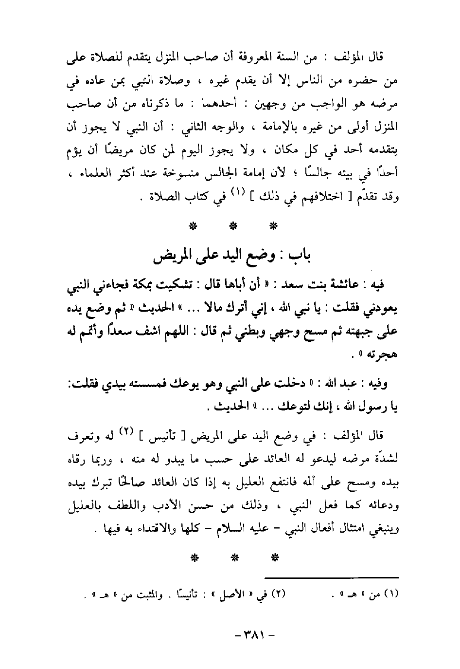 / 18 - فيه: عَائِشَةَ بِنْتِ سَعْدٍ، أَنَّ أَبَاهَا قَالَ: تَشَكَّيْتُ بِمَكَّةَ شَكْوًا شَدِيدًا، فَجَاءَنِي النَّبِي عليه السلام يَعُودُنِى، فَقُلْتُ: يَا نَبِيَّ اللَّهِ، إِنِّى أَتْرُكُ مَالا. . . . الحديث ثُمَّ وَضَعَ يَدَهُ عَلَى جَبْهَتِهِ، ثُمَّ مَسَحَ وَجْهِى وَبَطْنِى، ثُمَّ قَالَ: (اللَّهُمَّ اشْفِ سَعْدًا، وَأَتْمِمْ لَهُ هِجْرَتَهُ) . / 19 - وفيه: عَبْدُ اللَّهِ، دَخَلْتُ عَلَى النَّبِىّ عليه السلام وَهُوَ يُوعَكُ وَعْكًا شَدِيدًا، فَمَسِسْتُهُ بِيَدِى، فَقُلْتُ: يَا رَسُولَ اللَّهِ، إِنَّكَ لَتُوعَكُ. . . الحديث. قال المؤلف: فى وضع اليد على المريض تأنيس له وتعرف لشدة مرضه ليدعو له العائد على حسب مايبدو له منه، وربما رقاه بيده ومسح على ألمه فانتفع العليل به إذا كان العائد صالحًا تبرك بيده ودعائه كما فعل النبى، وذلك من حسن الأدب واللطف بالعليل وينبغى امتثال أفعال النبى عليه السلام كلها والاقتداء به فيها.