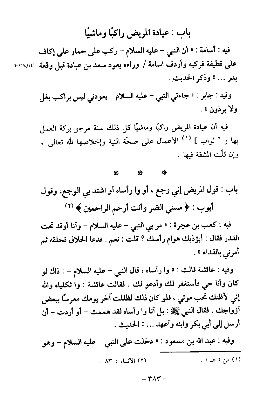 / 22 - فيه: أُسَامَةَ، أَنَّ النَّبِى عليه السلام رَكِبَ عَلَى حِمَارٍ عَلَى إِكَافٍ عَلَى قَطِيفَةٍ فَدَكِيَّةٍ، وَأَرْدَفَ أُسَامَةَ وَرَاءَهُ يَعُودُ سَعْدَ بْنَ عُبَادَةَ قَبْلَ وَقْعَةِ بَدْرٍ. . . وذكر الحديث. / 23 - وفيه: جَابِر، جَاءَنِى النَّبِى عليه السلام يَعُودُنِى لَيْسَ بِرَاكِبِ بَغْلٍ وَلا بِرْذَوْنٍ. فيه أن عيادة المريض راكبًا وماشيًا كل ذلك سنة مرجو بركة العمل بها وثواب الأعمال على صحة النية وإخلاصها لله تعالى وإن قلت المشقة فيها.
