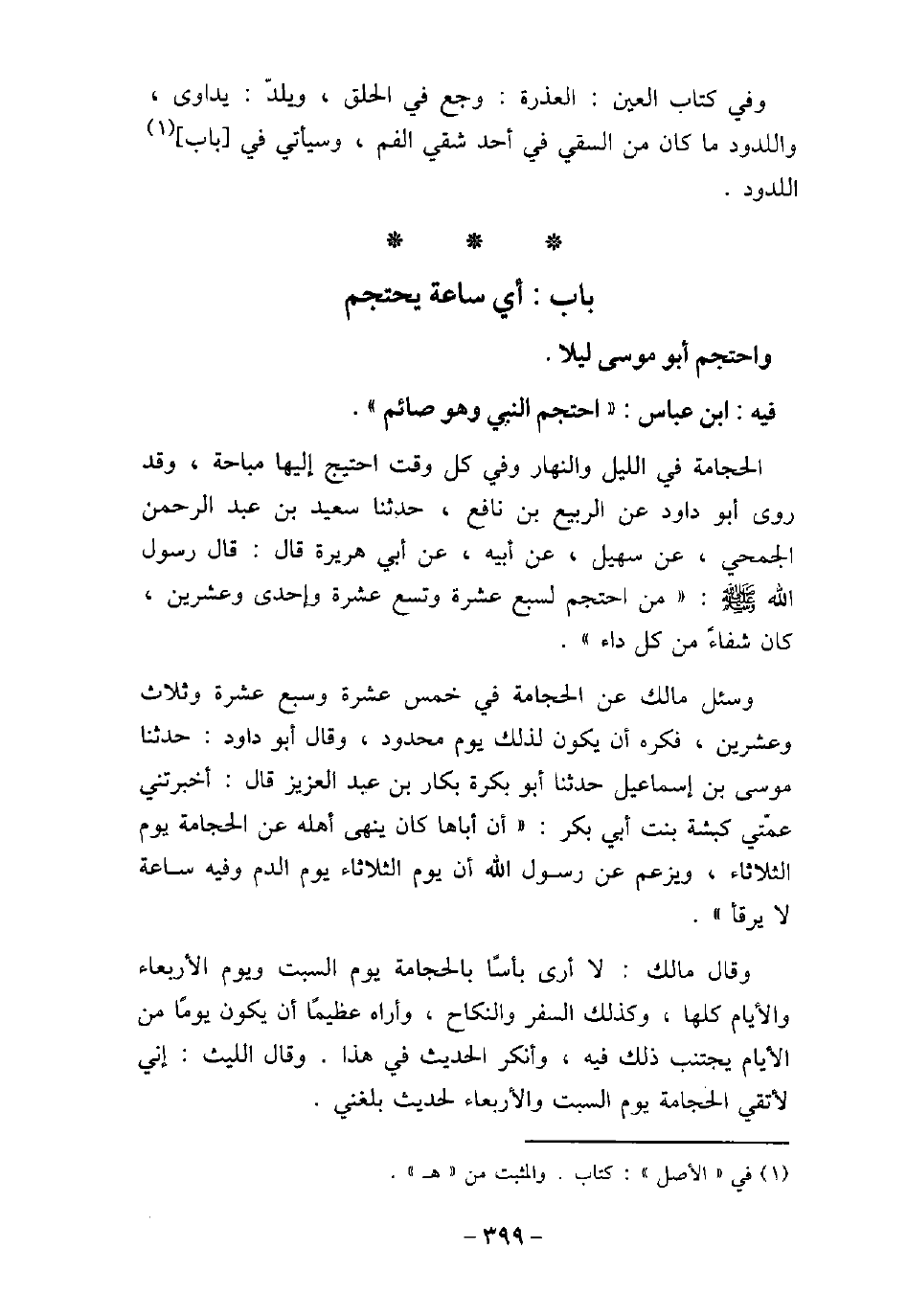 واحتجم أبو موسى ليلا. / 12 - فيه: ابْن عَبَّاس، احْتَجَمَ النَّبِىُّ عليه السلام وَهُوَ صَائِمٌ. الحجامة فى الليل والنهار وفى كل وقت احتيج اليها مباحة، وقد روى أبو داود عن الربيع بن نافع، حدثنا سعيد بن عبد الرحمن الجمحى، عن سهيل، عن أبيه، عن أبى هريرة قال: قال رسول الله (صلى الله عليه وسلم) : (من احتجم لسبع عشرة وتسع عشرة وإحدى وعشرين، كان شفاء من كل داء) . وسئل مالك عن الحجامة فى خمس وسبع عشرة وثلاث وعشرين، فكره أن يكون لذلك يوم محدود، وقال أبو داود: حدثنا موسى بن إسماعيل حدثنا أبو بكرة بكار بن عبد العزيز قال: أخبرتنى عمتى كبشة بنت أبى بكر: (أن أباها كان ينهى أهله عن الحجامة يوم الثلاثاء، ويزعم عن رسول الله أن يوم الثلاثاء يوم الدم وفيه ساعة لا يرقأ) . وقال مالم: لا أرى بأسا بالحجامة يوم السبت ويوم الأربعاء والأيام كلها، وكذلك السفر والنكاح، وأراه عظيما أن يكون يومًا من لأتقى الحجامة يوم السبت والأربعاء لحديث بلغني.