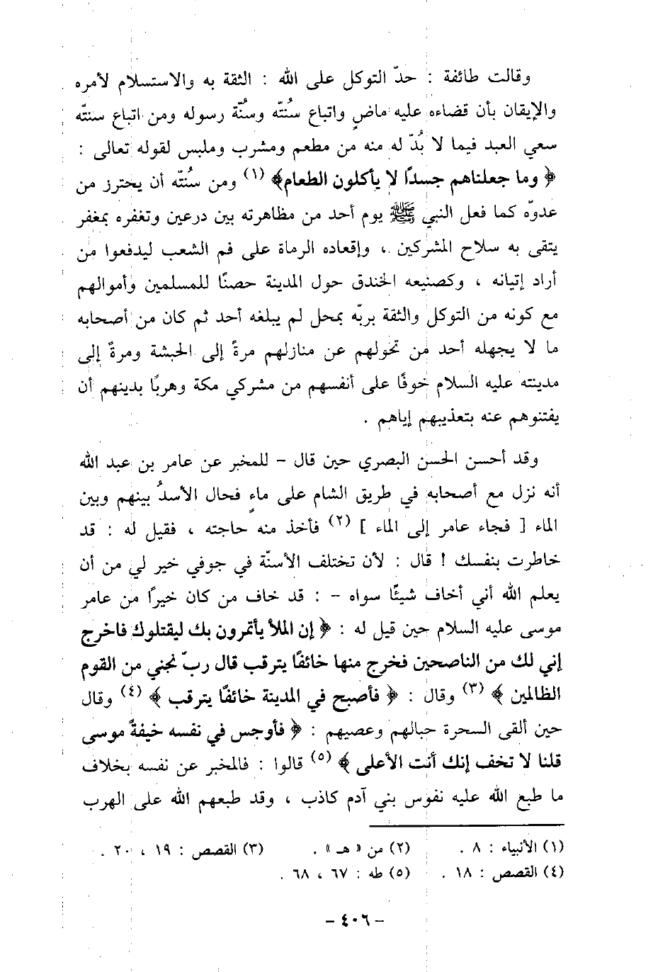 وقالت طائفة: حد التوكل على الله: الثقة به ولاستسلام لأمره والإيقان بأن قضاءه عليه ماض واتباع سنته وسنة رسوله ومن اتباع سنته سعى العبد فيما لابد له من مطعم ومشرب وملبس لقوله تعالى: (وما جعلناهم جسدًا لا يأكلون الطعام) ومن سنته أن يحترز من عدوه كما فعل النبى عليه السلام يوم أحد من مظاهرته بين درعين وتغفره بمغفر يتقى به سلاح المشركين، وإقعاده الرماة على فم الشعب ليدفعوا من أدراد إتيانه، وكصنيعة الخندق حول المدينة حصنًا للمسلمين وأموالهم مع كونه من التوكل والثقة بربه بمحل لم يبلغه أحد ثم كان من أصحابه ما لا يجهله أحد من تحولهم عن منازلهم مرة إلى الحبشة ومرة إلى مدينته عليه السلام خوفًا على أنفسهم من مشركى مكة وهربًا بدينهم أن يفتنوهم عنه بتعذيبهم إياهم. وقد أحسن الحسن البصرى حين قال - للمخبر عن عامر بن عبد الله أنه نزل مع أصحابه فى طريق الشام على ماء فحال الأسد بينهم وبين الماء فجاء عامر إلى الماء فأخذ منه حاجته، فقيل له: قد خاطرت بنفسك قال: لأن تختلف الأسنة فى جوفى خير لى من أن يعلم الله أنى أخاف شيئًا سواه -: قد خاف من كان خيرًا من عامر موسى عليه السلام حين قيل له: (إن الملأ يأتمرون بك ليقتلوك فاخرج إنى لك من الناصحين فخرج منها خائفًا يترقب قال رب نجنى من القوم الظالمين) وقال: (فأصبح فى المدينة خائفًا يترقب) وقال حين القى السحرة حبالهم وعصيهم: (فأوجس فى نفسه خيفة موسى قلنا لاتخف إنك أنت الأعلي) قالوا: فالمخبر عن نفسه بخلاف ماطبع الله نفوس بنى آدم كاذب، وقد طبعهم الله على الهرب مما يضرهم،