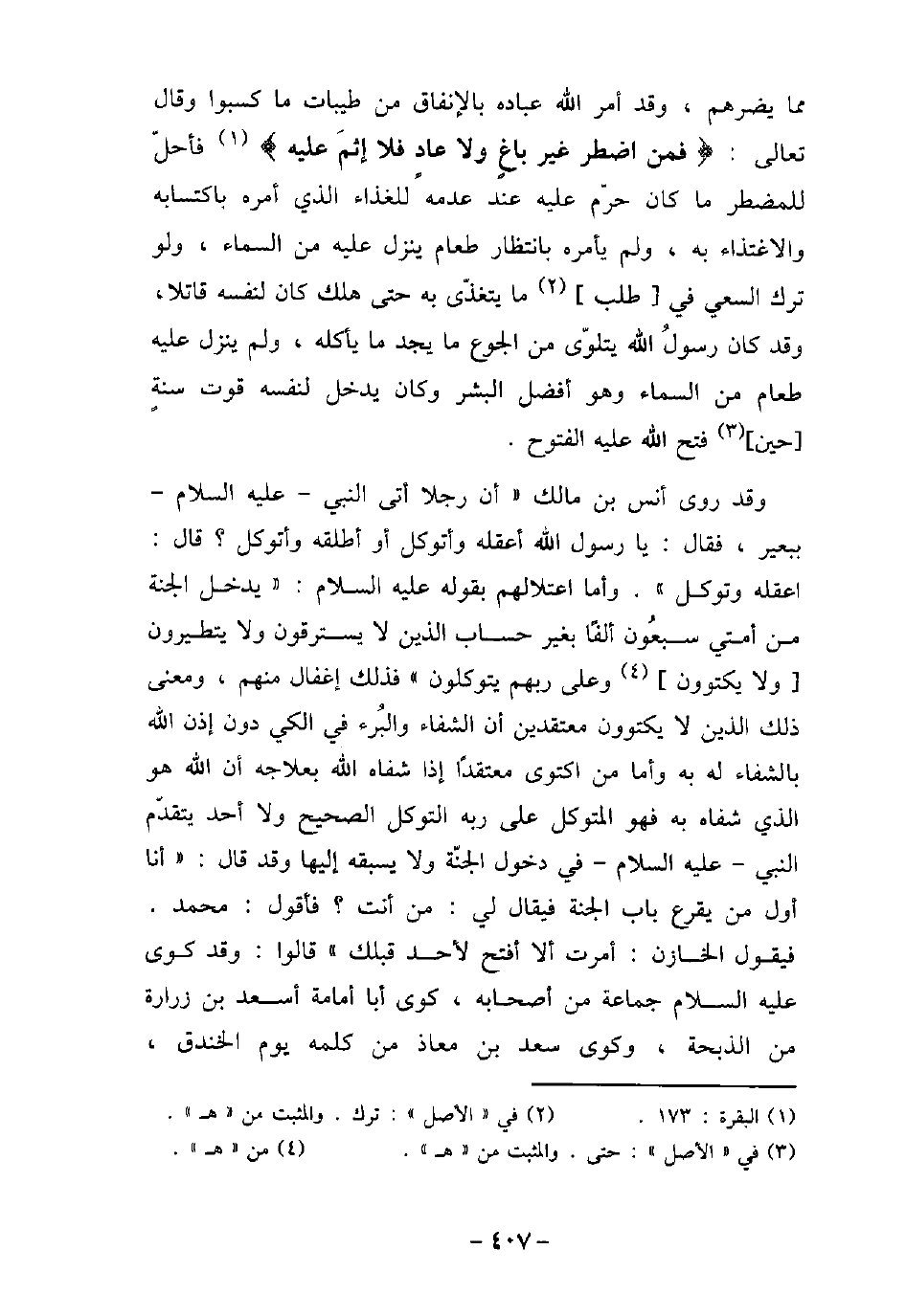 وقد أمر الله عباده بالإنفاق من طيبات ماكسبوا وقال تعالى: (فمن اضطر غير باغ ولا عاد فلا إثم عليه) فأحل للمضطر ماكان حرم عليه عند عدمه للغذاء الذى أمره باكتسابه والاغتذاء به، ولم يأمره بانتظار طعام ينزل عليه من السماء، ولو ترك السعى فى طلب مايتغذى به حتى هلك كان لنفسه قاتلا، وقد كان رسول الله يتلوى من الجوع مايجد مايأكله، ولم ينزل عليه طعام من السماء وهو أفضل البشر وكان يدخل لنفسه قوت سنه حين فتح الله عليه الفتوح. وقد روى أنس بن مالك (أن رجلا أتى النبى عليه السلام ببعير، فقال: يارسول الله أعقله وأتوكل أو أطلقه وأتوكل؟ قال: اعقله وتوكل) . وأما اعتلالهم بقوله عليه السلام: (يدخل الجنة من أمتى سبعون الفًا بغير حساب الذين لايسترقون ولايتطيرون ولايكتوون ةعلى ربهم يتوكلون) فذلك إغفال منهم، ومعنى ذلك الذين يايكتوون معتقدين أن الشفاه الله بعلاجه أن الله هو الذى شفاه به فهو المتوكل على ربه التوكل الصحيح ولا أحد يتقدم النبى عليه السلام فى دخول الجنة ولايسبقه إليها وقد قال: (أنا أول من يقرع باب الجنة فيقال لى: من أنت؟ فأقول: محمد فيقول الخازن: أمرت ألا أفتح لأحد قبلك) قالوا: وقد كوى عليه السلام جماعة من أصحابه، كوى أبا أمامه أسعد بن زرارة من الذبحة، وكوى سعد بن معاذ من كلمه يوم الخندق،