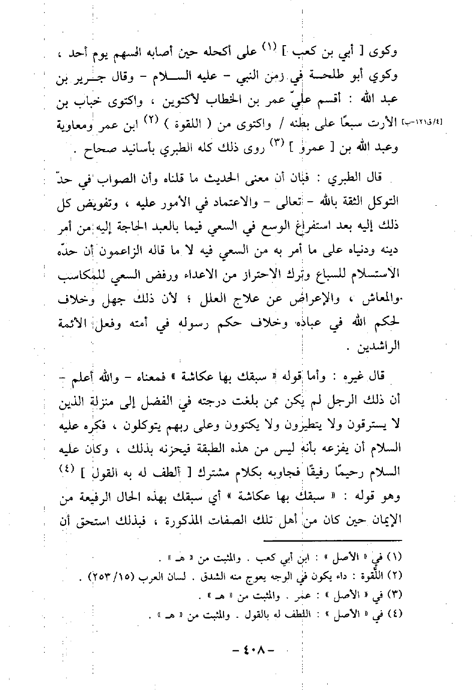 وكوى أبى بن كعب على أكحله حين أصابه السهم يوم أحد، وكوى أبو طلحة فى زمن النبى عليه السلام وقال جرير بن عبد الله: أقسم على بن عمر بن الخطاب لأكتوين، واكتوى خباب بن الأرت سبعًا على بطنه واكتوى من اللقوة ابن عمر ومعاوية وعبد الله بن عمرو روى ذلك كله الطبرى بأسانيد صحاح. قال الطبرى: فبان أن معنى الحديث ماقلناه وأن الصواب فى حد التوكل الثقة بالله تعالى والاعتماد فى الأمور عليه، وتفويض كل ذلك إليه بعد استفراغ الوسع فى السعى فيما بالعبد الحاجة إليه من أمر دينه ودنياه على ما أمر به من السعى فيه لا مالقله الزاعمون أن حدة الاستسلام للسباع وترك الاحتراز من الاعداء ورفض السعى للمكاسب والمعاش، والإعراض عن علاج العلل؛ لأن ذلك جهل وخلاف لحكم الله فى بعاده. وخلاف حكم رسوله فى أمته وفعل الأثمه الراشدين. قال غيره: وأما قوله: (سبقك بها عكاشة) فمعناه - والله أعلم - أن ذلك الرجل لم يكن ممن بلغت درجته فى الفضل إلى منزلة الذين لايسترقون ولايتطيرون ولايكتوون وعلى ربهم يتوكلون، فكره عليه السلام أن يفزعه بأنه ليس من هذه الطبقة فيحزنه بذلك، وكان عليه السلام رحيمًا رفيقًا فجابه بكلام مشترك ألف به به القول وهو قوله: (سبقك بها عكاشة) أى سبقك بهذه الحال الرفيعة من الإيمان حين كان من أهل تلك الصفات المذكورة، فبذلك استحق أن
