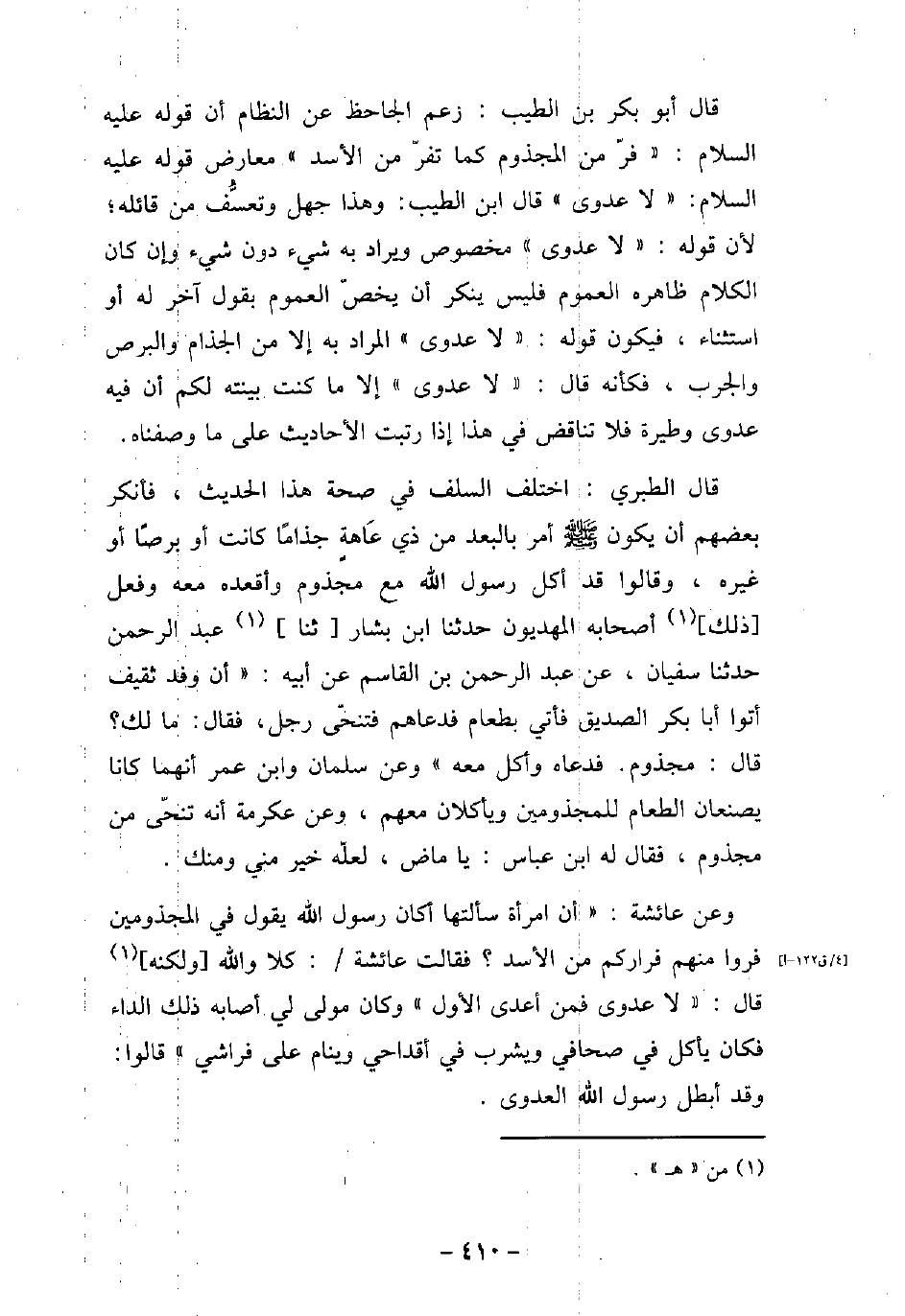 قال أبو بكر بن الطيب: زعم الجاحظ عن النظام أن قوله عليه السلام: (فر من المجذوم كما تفر من الأسد) معارض قوله عليه السلام (لا عدوى) قال ابن الطيب: وهذا جهل وتعسف من قائله؛ لأن قوله: (لا عدوى) مخصوص ويراد به شىء دون شىء وإن كان الكلام ظاهرة العموم فليس ينكر أن يخص العموم بقول آخر له أو استثناء، فيكون قوله: (لا عدوى) المراد به إلا من الجذام والبرص والجرب، فكأنه قال: (لا عدوى) إلا ماكنت بينته لكم أن فيه عدو وطيره فلا تناقص فى هذا إذا رتب الأحاديث على ماوصفناه. قال الطبرى: اختلف السلف فى صحة هذا الحديث، فأنكر بعضهم أن يكون عليه السلام أمر بالبعد من ذى عاهه جذامًا كانت برصًا أو غيره وقالوا قد أكل رسول الله مع مجذوم وأقعده معه وفعل ذلك أصحابه المهديون حدثنا ابن بشار ثنا عبد الرحمن حدثنا سفيان، عن عبد الرحمن بن القاسم عن أبيه: (أن وفد ثقيف أتوا أبا بكر الصديق فأتى بطعام فدعاهم فتنحى رجل، فقال مالك؟ قال: مجذوم. فدعاه وأكل معه) وعن سلمان وابن عمر أنهما كانا يصنعان الطعام للمجذومين ويأكلان معهم، وعن عكرمة أنه تنحى من مجذوم، فقال له ابن عباس: ياماض، لعله خير منى ومنك. وعن عائشة: (أن امرأة سألتها أكاد رسول الله يقول فى المجذومين فروا منهم فراركم من الأسد؟ فقالت عائشة كلا والله ولكنه قال: لا عدوى فمن أعدى الأول) وكان مولى لى أصابه ذلك الداء فكان يأكل فى صحافى ويشرب فى أقداحى وينام على فراشى. قالوا: وقد أبطل رسول الله العدوى.