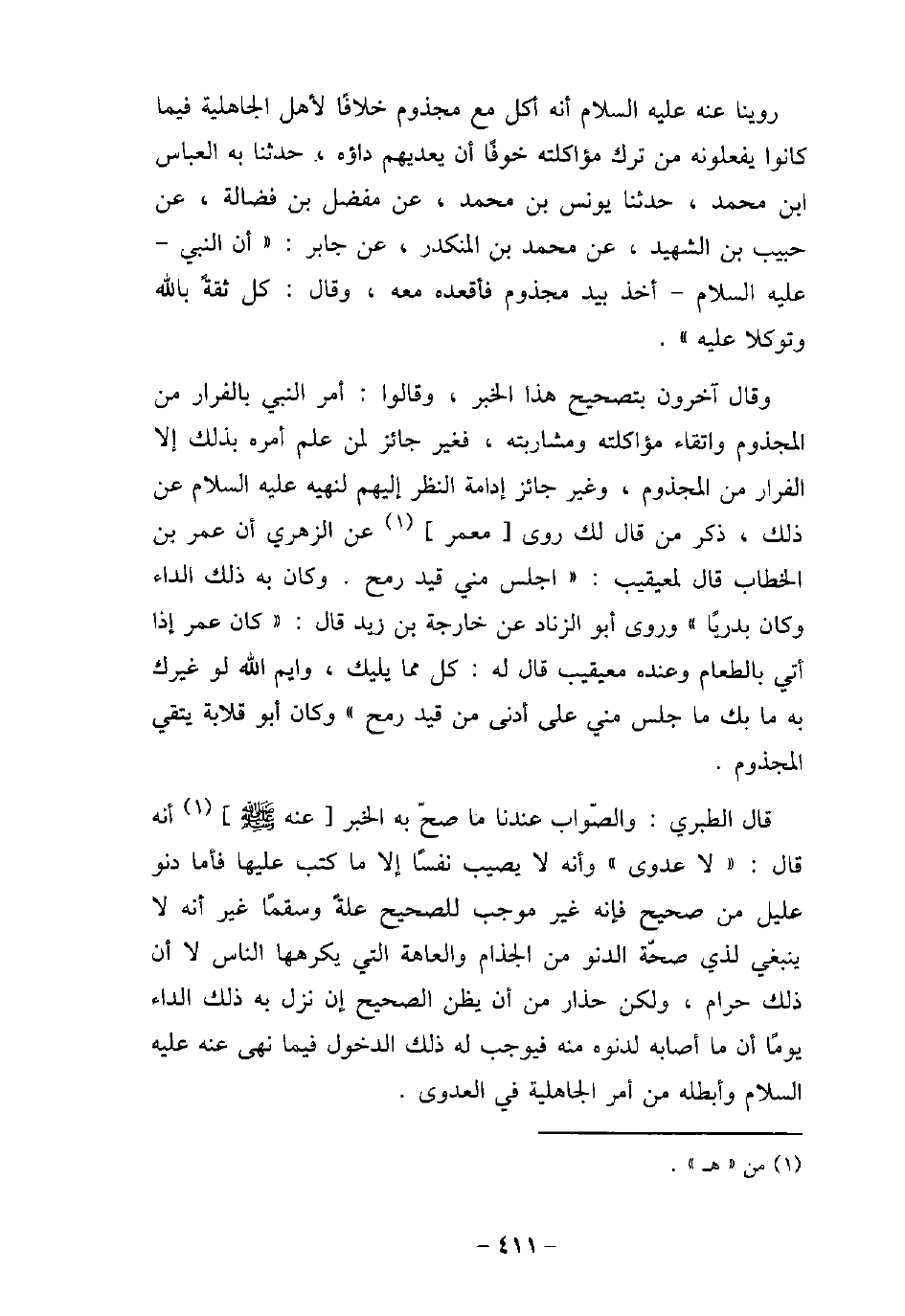 روينا عنه عليه السلام أنه أكل مع مجذوم خلافًا لأهل الجاهلية فيما كانوا يفعلونه من ترك مؤاكلته خوفًا أن يعديهم داؤه، حدثنا به العباس ابن محمد، حديثنا يونس بن محمد، عن مفضل بن فضالة، عن حبيب بن الشهيد، عن محمد بن المنكدر، عن جابر: (أن النبى عليه السلام أخذ بيد مجذوم فأقعده معه، وقال: كل ثقة بالله وتوكلا عليه) . وقال آخرون بتصحيح هذا الخبر، وقالوا: أمر النبى بالفرار من المجذوم واتقاء مؤاكلته ومشاربته، فغير جائز لمن علم أمره بذلك إلا الفرار من المجذوم، وغير جائز إدامته النظر إليهم لنهيه عليه السلام عن ذلك، ذكر من قال لك روى معمر عن الزهرى أن عمر بن الخطاب قال لمعقيب: (اجلس منى قيد رمح. وكان به ذلك الداء وكان بدريًا) وروى أبو الزناد عن خارجة بن زيد قال: (كان عمر إذا أتى بالطعام وعنده معيقيب قال: كل مما يليك، وايم الله لو غيرك به مابك ماجلس منى على أدنى من قيد رمح) وكان أبو قلابة يتقى المجذوم. قال الطبرى: والصواب عندنا ما صح به الخبر عنه (ص) ، أنه قال: (لا عدوى) وأنه لا يصيب نفسًا إلا ما كتب عليها فأما دنو عليل من صحيح فإنه غير موجب للصحيح عله وسقمًا غير أنه لا ينبغى لذى صحة الدنو من الجذام والعاهة التى يكرها الناس لا أن ذلك حرام، ولكن حذار من أن يظن الصحيح إن نزل ذلك الداء يومًا أن ماأصابه لدنوه منه فيوجب له ذلك الدخول فيما نهى عنه عليه السلام وأبطله من أمر الجاهلية فى العدوى.