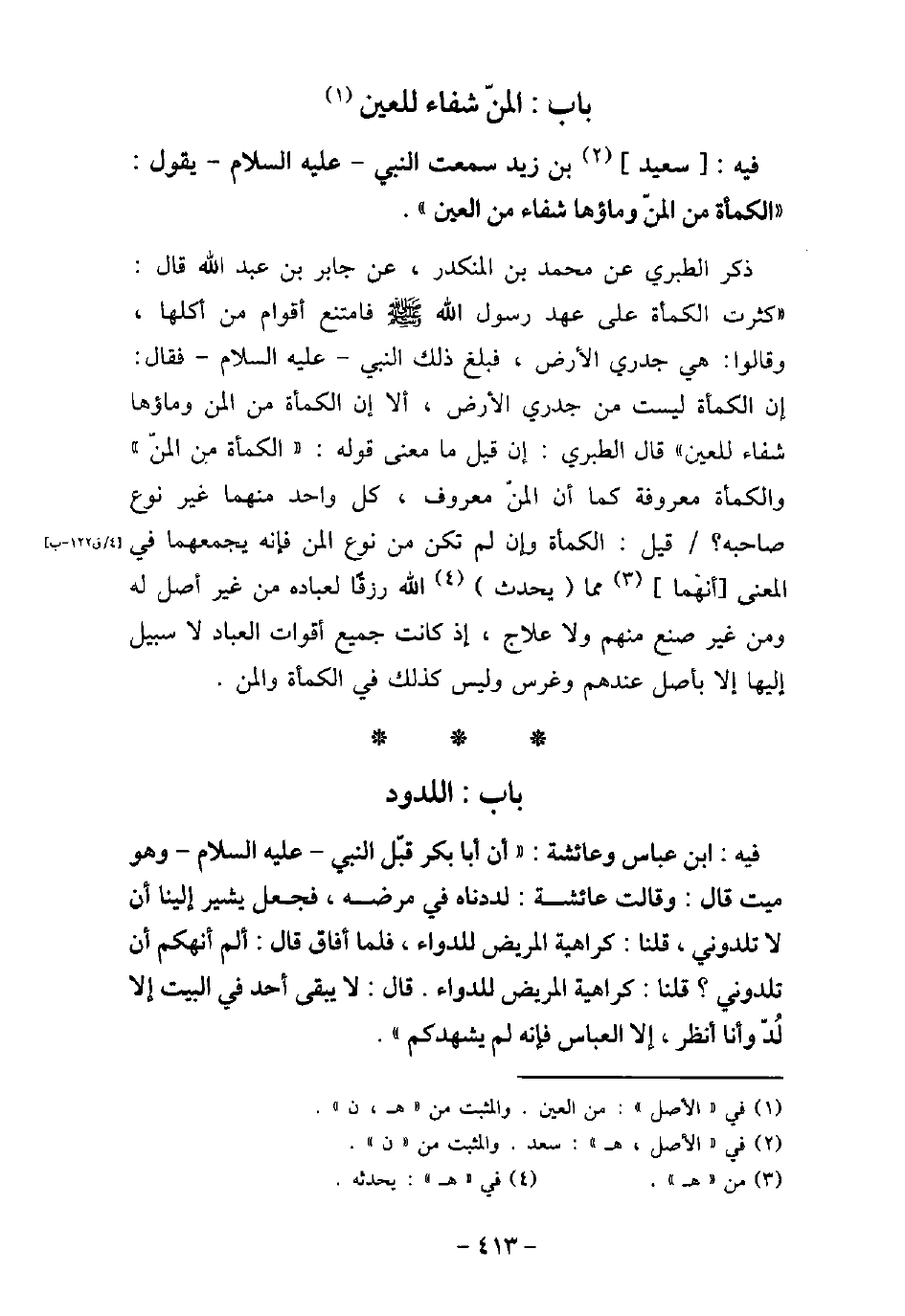 / 24 - فيه: سَعِيدَ بْنَ زَيْدٍ، سَمِعْتُ النَّبِى عليه السلام يَقُولُ: (الْكَمْأَةُ مِنَ الْمَنِّ، وَمَاؤُهَا شِفَاءٌ لِلْعَيْنِ) . ذكر الطبرى عن محمد بن المنكدر، عن جابر بن عبد الله قال: (كثرت الكمأة على عهد رسول الله عليه السلام فامتنع أقوام من أكلها، وقالوا: هى جدى الأرض، فبلغ ذلك النبى عليه السلام فقال: إن الكمأة ليست من جدى الأرض، ألا إن الكمأة من المن وماؤها شفاء للعين) قال الطبرى: إن قيل مامعنى قوله: (الكمأة من المن) والكمأة معروفة كما أن المن معروف، كل واحد منهما غير نوع صاحبه؟ قيل: الكمأة وإن لم تكن من نوع المن فإنه يجمعهما فى المعنى أنهما مما يحدث الله رزقًا لعباده من غير أصل له ومن غير صنع منهم ولاعلاج، إذ كانت جميع أقوات العباد لا سبيل إليها إلا بأصل عندهم وغرس وليس كذلك فى الكمأة والمن.