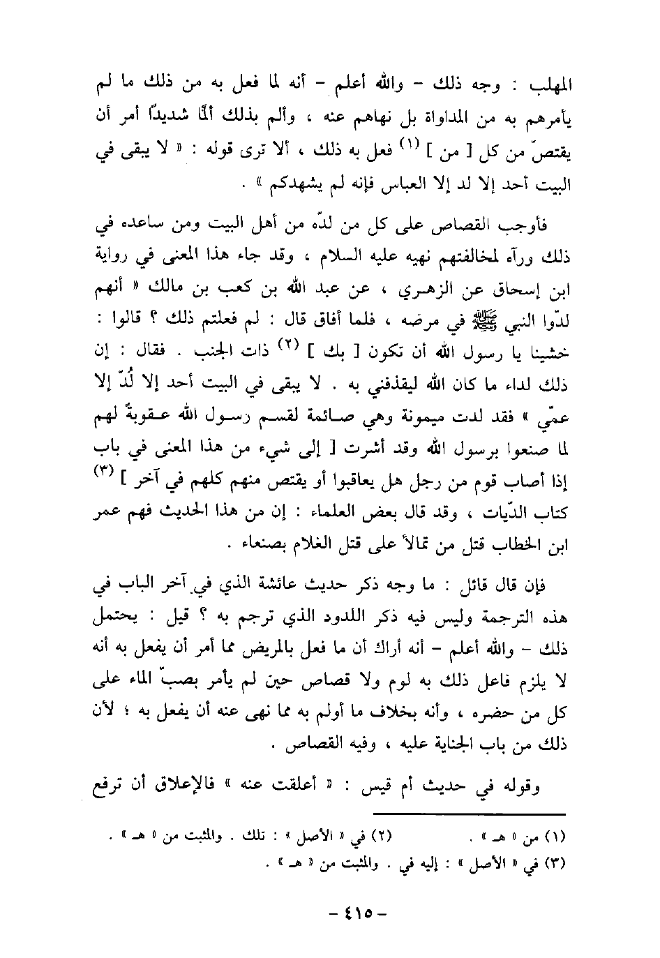 المهلب: وجه ذلك - والله أعلم - أنه لما فعل به من ذلك ما لم يأمرهم به من المداواة بل نهاهم عنه، وألم بذلك ألماً شديداً أمر أن يقتصّ من كل [من] فعل به ذلك، ألا ترى قوله: لا يبقى في البيت أحد إلا لد إلا العباس فإنه لم يشهدكم. فأوجب القصاص على كل من لده من أهل البيت ومن ساعده فى ذلك ورآه لمخالفتهم نهيه عليه السلام، وقد جاء هذا المعنى فى رواية ابن إسحاق عن الزهرى، عن عبد الله بن كعب بن مالك (أنهم لدوا النبى عليه السلام فى مرضه، فلما أفاق قال: لم فعلتم ذلك؟ قالوا خشينا يارسول الله أن تكون بك ذات الجنب. فقال: إن ذلك لداء ماكان الله ليقذفنى به. لا يبقى فى البيت أحد إلا لد إلا عمى) فقد لدت ميمونة وهى صائمة لقسم رسول الله عقوبة لهم لما صنعوا برسول الله وقد أشرت إلى شىء من هذا المعنى فى باب إذا أصاب قوم من رجل هل يعاقبون أو يقتص منهم كلهم فى آخر كتاب الديات، وقد قال بعض العلماء: إن من هذا الحديث فهم عمر ابن الخطاب قتل من تمالأ على قتل الغلام بصنعاء. فإن قال قائل: ماوجه ذكر حديث عائشة الذى فى آخر فى هذه الترجمة وليس فيه ذكر اللدود الذى ترجم به؟ قيل: يحتمل ذلك - والله أعلم - أنه أراك أن مافعل بالمريض مما أن يفعل به أنه لايلزم فاعل ذلك به لوم ولاقصاص حين لم يأمر بصب الماء على كل من حضره، وأنه بخلاف ما أولم له مما نهى أن يفعل به؛ لأن ذلك من باب الجناية عليه، وفيه القصاص. وقوله فى حديث أم قيس: (أعلقت عنه) فالإعلاق أن ترفع