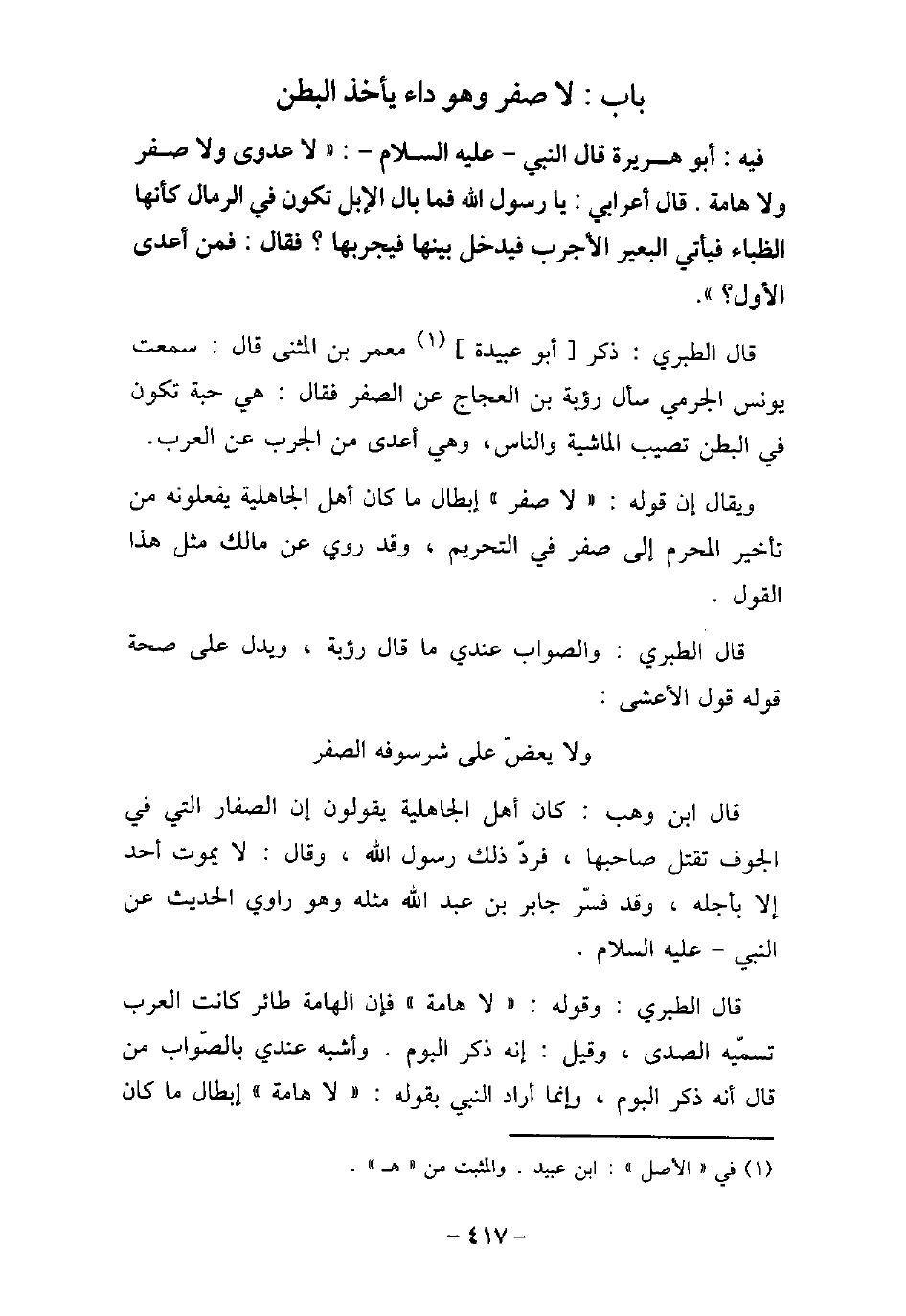 / 29 - فيه: أَبُو هُرَيْرَةَ، قَالَ النَّبِىّ (صلى الله عليه وسلم) : (لا عَدْوَى، وَلا صَفَر، وَلا هَامَةَ) ، فَقَالَ أَعْرَابِيٌّ: يَا رَسُولَ اللَّه، فَمَا بَالُ إِبِلِى تَكُونُ فِى الرَّمْلِ كَأَنَّهَا الظِّبَاءُ، فَيَأْتِى الْبَعِيرُ الأجْرَبُ، فَيَدْخُلُ بَيْنَهَا فَيُجْرِبُهَا، فَقَالَ: (فَمَنْ أَعْدَى الأوَّلَ) . قال الطبرى: ذكر أبو عبيدة معمر بن المثنى قال: سمعت يونس الجرمى سأل رؤبة العجاج عن الصفر فقال: هى حبة تكون فى البطن تصيب الماشية والناس، وهى أعدى من الجرب عن العرب. ويقال إن قوله: (لا صفر) إبطال ما كان أهل الجاهلية يفعلونه من تأخير المحرم إلى صفر فى التحريم، وقد روى عن مالك مثل هذا القول. قال الطبرى: والصواب عندى ماقال رؤبة، ويدل على صحة قوله قول الأعشى: ولا يعض على سرشوفه الصفر قال ابن وهب: كان أهل الجاهلية يقولون إن الصفار التى فى الجوف تقتل صاحبها، فرد ذلك رسول الله، وقال: لايموت أحد إلا بأجله، وقد فسر جابر بن عبد الله وهو رواى الحديث عن النبى - عليه السلام. قال الطبرى: وقوله: (لا هامة) فإن الهامة طائر كانت العرب تسميه الصدى، وقيل: إنه ذكر البوم. وأشبه عندى بالصواب من قال أنه ذكر البوم، وإنما أراد النبى بقوله: (لا هامة) إبطال ما كان