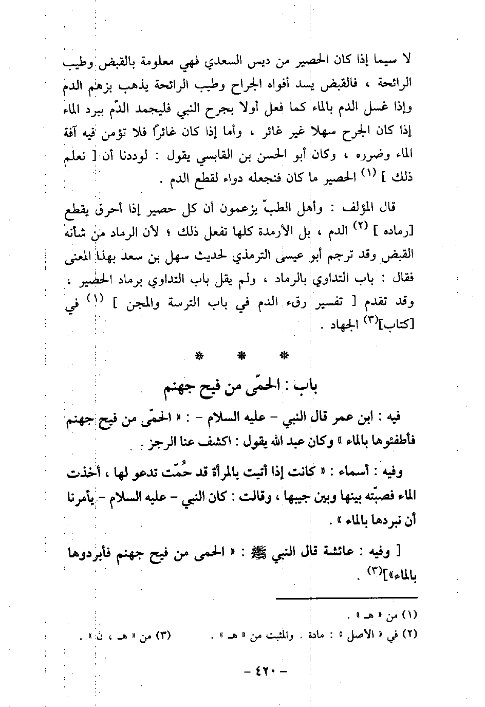 / 33 - فيه: ابْن عُمَر، قَالَ النَّبِى (صلى الله عليه وسلم) : (الْحُمَّى مِنْ فَيْحِ جَهَنَّمَ فَأَطْفِئُوهَا بِالْمَاءِ) ، وَكَانَ عَبْدُاللَّهِ يَقُولُ: اكْشِفْ عَنَّا الرِّجْزَ. / 34 - وفيه: أَسْمَاءَ، كَانَتْ إِذَا أُتِيَتْ بِالْمَرْأَةِ قَدْ حُمَّتْ، تَدْعُو لَهَا، أَخَذَتِ الْمَاءَ فَصَبَّتْهُ بَيْنَهَا وَبَيْنَ جَيْبِهَا، قَالَتْ: وَكَانَ النَّبِىّ عليه السلام يَأْمُرُنَا أَنْ نَبْرُدَهَا بِالْمَاءِ. / 35 - وفيه: عَائِشَةَ، قَالَ النَّبِى (صلى الله عليه وسلم) : (الْحُمَّى مِنْ فَيْحِ جَهَنَّمَ، فَابْرُدُوهَا بِالْمَاءِ) .