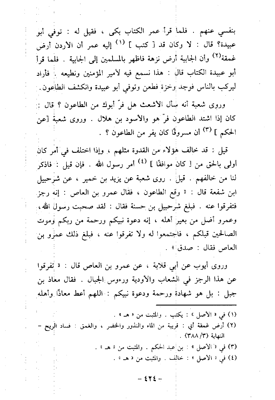 بنفسي عنهم. فلما عمر الكتاب بكى، فقيل له: توفى أبو عبيدة؟ قال: لا وكان قد كتب إليه عمر أن الأردن أرض غمقة وأن الجابية أرض نزهة فاظهر بالمسلمين إلى الجابية. فلما قرأ أبو عبيدة الكتاب قال: هذا نسمع فيه لأمير المؤمنين ونطيعه. فأراد ليركب بالناس فوجد وخزة فطعن وتوفى أبو عبيدة وإنكشف الطاعون) . وروى شعبة أنه سأل الأشعث هل فرّ أبوك من الطاعون؟ قال كان إذا اشتد الطاعون فر هو والأسود بن هلال. وروى شعبه عن الحكم أن مسروقًا كان يفر من الطاعون؟ . قيل: قد خالف هؤلاء من القدوة مثلهم، وإذا اختلف فى أمر كان أولى بالحق من كان موافقًا أمر رسول الله. فإن قيل: فاذكر لنا من خالفهم. قيل. روى شعبه عن يزيد بن خمير، عن شر حبيل ابن شفعة قال: (وقع الطاعون، فقال عمرو بن العاص: إنه رجز فتفرقوا عنه. فبلغ شرحبيل بن حسنة فقال: لقد صحبت رسول الله وعمرو أضل من بعير أهله، وإنه دعوة نبيكم ورحمة من ربكم وموت الصالحين قبلكم، فاجتمعوا له ولا تفرقوا عنه، فبلغ ذلك عمرو بن العاص فقال: صدق) . وروى أيوب عن أبى قلابة، عن عمرو بن العاص قال: (تفرقوا عن هذا الرجز فى الشعبا والأدوية ورؤوس الجبال. فقال معاذ بن جبل: بل هو شهادة ورحمة ودعوة بيكم: اللهم أعط معاذًا وأهله