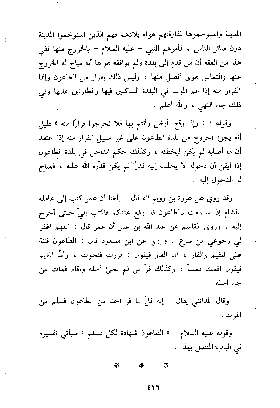 المدينة واستوخموها لمفارقهم هواء بلادهم فهم الذين استوخموا المدينة دون سائر الناس، فأمرهم النبى عليه السلام بالخروج منها ففى هذا من الفقه أن من قدم إلى بلده ولم يوافقه هواها أنه مباح له الخروج عنها والتماس هوى أفضل منها، وليس ذلك بفرار من الطاعون وإنما الفرار منه إذا عم الموت فى البلدة الساكنين فيها والطائرين عليها وفى ذلك جاء النهى، والله أعلم. وقوله: (وإذا وقع بأرض وأنتم بها فلا تخرجوا فرار منه) دليل أنه يجوز الخروج من بلدة الطاعون على غير سبيل الفرار منه إذا اعتقد أن ماأصابه لم يكن ليخطئه، وكذلك حكم الداخل فى بلدة الطاعون إذا أيقن أن دخوله لايجلب إليه قدرًا لم يكن قدره الله عليه، فمباح له الدخول إليه. وقد روى عن عروة بن رويم أنه قال: بلغنا أن عمر كتب إلى عامله بالشام إذا سمعت بالطاعون قد وقع عندكم فاكتب إلى حتى أخرج إليه. وروى القاسم عن عبد الله بن عمر أن عمر قال: اللهم اغفر لى رجوعى من سرغ وروى عن ابن مسعود قال: الطاعون فتنة على المقيم والفار، أما الفار فيقول: فررت فنجوت، وأما المقيم فيقول أقمت فمت، وكذلك فرّ من لم يجىء أجله وأقام فمات من جاء أجله. وقال المدائنى يقال: إنه قلّ مافر أحد من الطاعون فسلم من الموت. وقوله عليه السلام: (الطاعون شهادة لكل مسلم) سيأتى تفسيرة فى الباب المتصل بهذا.