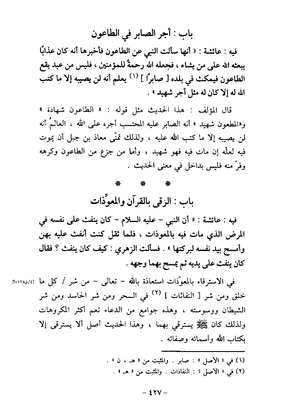 / 42 - فيه: عَائِشَةَ، أَنَّ النَّبِى عليه السلام كَانَ يَنْفُثُ عَلَى نَفْسِهِ فِى الْمَرَضِ الَّذِى مَاتَ فِيهِ بِالْمُعَوِّذَاتِ، فَلَمَّا ثَقُلَ، كُنْتُ أَنْفِثُ عَلَيْهِ بِهِنَّ، وَأَمْسَحُ بِيَدِ نَفْسِهِ لِبَرَكَتِهَا، فَسَأَلْتُ الزُّهْرِىَّ: كَيْفَ يَنْفِثُ؟ قَالَ: كَانَ يَنْفِثُ عَلَى يَدَيْهِ، ثُمَّ يَمْسَحُ بِهِمَا وَجْهَهُ. فى الاسترقاء بالمعوذات استاذة بالله تعالى من شر كل من خلق ومن شر النفاثات فى السحر ومن شر الحاسد ومن شر الشيطان ووسوسته، وهذه جوامع من الدعاء تعم أكثر المكروهات ولذلك كان عليه السلام يسترقى بهما، وهذا الحديث أصل ألا يسترقى إلا بكتاب الله وأسمائه وصفاته.