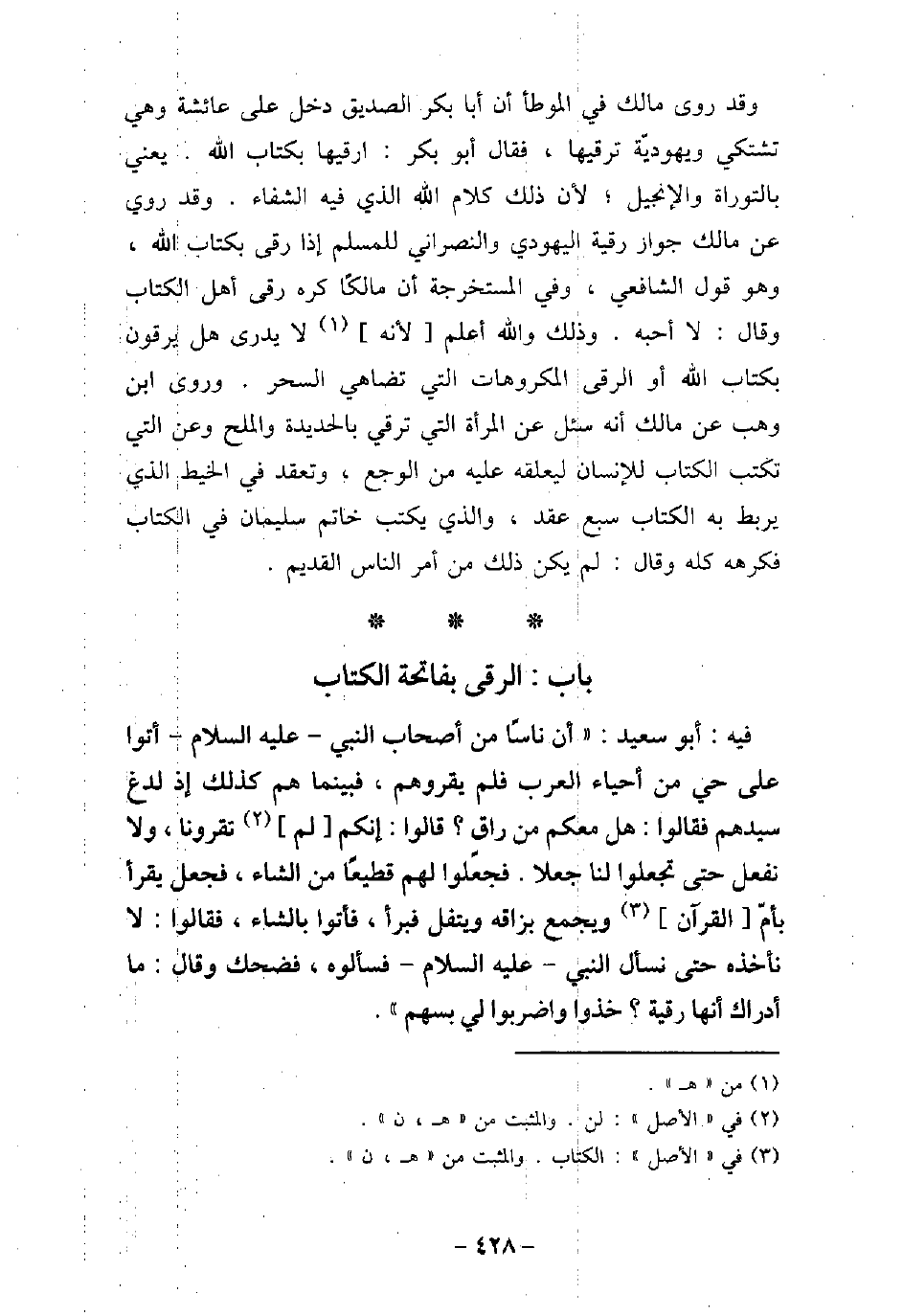 وقد روى مالك فى الموطأ أن أبا بكر الصديق دخل على عائشة وهى تشتكى ويهودية ترقيها، فقال أبو بكر: ارقيها بكتاب الله. يعنى بالتوراة والانجيل؛ لأن ذلك كلام الله الذى فيه الشفاء. وقد روى عن مالك جواز رقية اليهودية والنصرانى للمسلم إذا رقى بكتاب الله، وهو قول الشافعى، وفى المستخرجة أن مالكًا كره رقى أهل الكتاب وقال: لا أحبه. وذلك والله أعلم لأنه لايدرى هل يرقون بكتاب الله أو الرقى المكروهات التى تضاهى السحر. وروى ابن وهب عن مالك أنه سئل عن المرأة التى ترقى بالحديدة والملح وعن التى تكتب الكتاب للإنسان ليعلقه عليه من الوجع، وتعقد فى الخيط الذى يربط به الكتاب سبع عقد، والذى يكتب خاتم سليمان فى الكتاب فكرهه كله وقال: لم يكن ذلك من أمر الناس القديم.