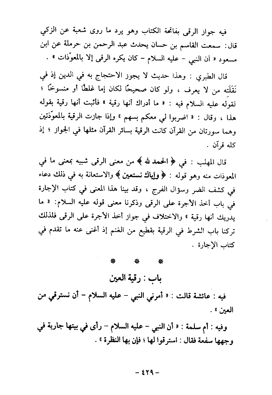 فيه: جواز الرقى بفاتحة الكتاب وهو يرد ماروى شعبه عن الزكى قال: سمعت القاسم بن حسان يحدث عبد الرحمن بن حرملة عن ابن مسعود (أن النبى عليه السلام كان يكره الرقى إلا بالمعوذات) . قال الطبرى: وهذا حديث لا يجوز الاحتجاج به فى الدين إذ فى نقلته من لايعرف، ولو كان صحيحًا لكان إما غلطًا أو منسوخًا؛ لقوله عليه السلام فيه: (ما أدراك أنها رقية) فأثبت أنها رقية بقوله عليه السلام فيه: (ما أدراك أنها رقية) ، فأثبت أنها رقية بقوله هذا، وقال: (اضربوا لى معكم بسهم) وإذا جازت الرقية بالمعوذتين وهما سورتان من القرآن كانت الرقية بسائر القرآن مثلها فى الجواز؛ إذ كله قرآن قال المهل: فى (الحمد لله) من معنى الرقى شبيه بمعنى مافى المعوذات منه وهو قوله: (وإياك نستعين) والاستعانة به فى ذلك دعاء فى كشف الضر وسؤال الفرج، وقد بينا هذا المعنى فى كتاب الإجارة فى باب أخذ الأجرة على الرقى وذكرنا معنى قوله عليه السلام: (ما يدريك أنها رقية) والاختلاف فى جواز أخذ الأجرة على الرقى فلذلك تركنا باب الشرط فى الرقية بقطيع من الغنم إذ أغنى عنه ماتقدم فى كتاب الإجارة.