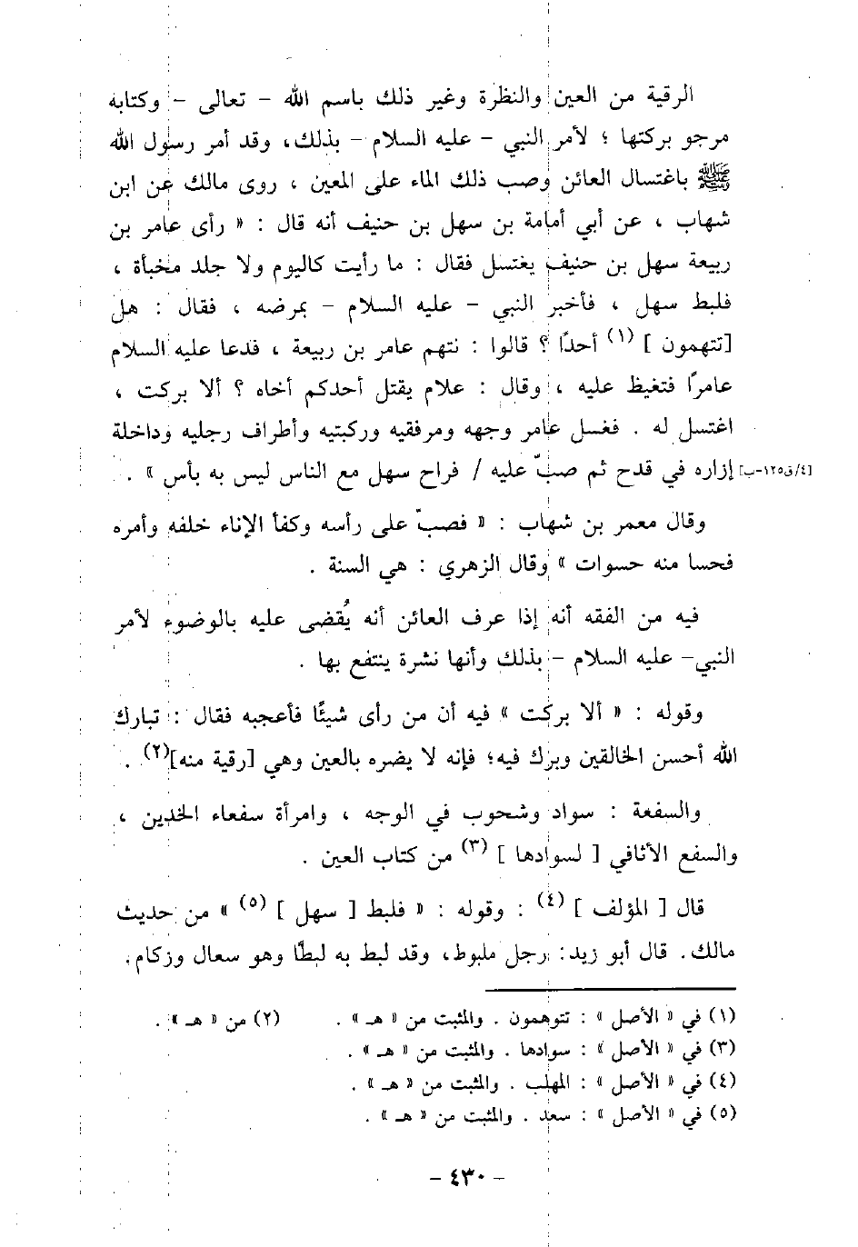 الرقية من العين والنظرة وغير ذلك باسم الله تعالى وكتابه مرجو بركتها؛ لأمر النبى عليه السلام بذلك، وقد أمر رسول الله عليه السلام باغتسال العائن وصب ذلك بالماء على العين. روى مالك عن ابن شهاب، عن أبى أمامه بن سهل بن حنيف أنه قال: (رأى عامر بن ربيعة سهل بن حنيف يغتسل فقال: مارأيت كاليوم ولاجلد مخبأ، فلبط سهل، فأخبر النبى عليه السلام بمرضه، فقال: هل تتهمون أحدًا قالوا: نتهم عامر بن ربيعة، فدعا عليه السلام عامرًا فتغيظ عليه، وقال: علام يقتل أحدكم أخاه؟ ألا بركب، اغتسل له. فغسل عامر وجهه ومرفقيه وركبتيه وأطراف رجليه وداخله إزاره فى قدح ثم صب عليه فراح سهل مع الناس ليس به بأس) . فيه من الفقه أنه إذا عرف العائن أنه يقضى عليه بالوضوء لأمر النبى عليه السلام بذلك وأنها نشرة ينتفع بها. وقوله: (ألا بركت) فيه أن من رأى شيئًا فأعجبه فقال: تبارك الله أحسن الخالقين وبرك فيه؛ فإنه لايضره بالعين وهى رقية منه. والسفع: سواد وشحوب فى الوجه، وامرأة سفعاء الخدين، والسفع الأثافى لسوادها من كتاب العين. قال المؤلف: وقوله: (فلبط سهل) من حديث مالك. قال أبو زيد: رجل ملبوط، وقد لبطًا وهو سعال وزكام.