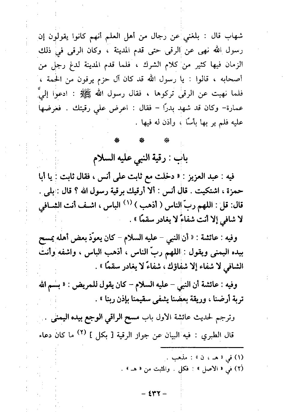 شهاب قال: بلغني عن رجال من أهل العلم أنهم كانوا يقولون إن رسول الله نهى عن الرقي حتى قدم المدينة، وكان الرقي فى ذلك الزمان فيها كثير من كلام الشرك، فلما قدم المدينة لدغ رجل من أصحابه، قالوا: يارسول الله قد كان آل حزم يرقون من الحمة، فلما نهيت عن الرقى تركوها، فقال رسول الله عليه السلام ادعوا إلى عمارة - وكان قد شهد بدرًا - فقال: اعرض على رقبتك. فعرضها عليه فلم ير بها بأسًا، وأذن له فيها.