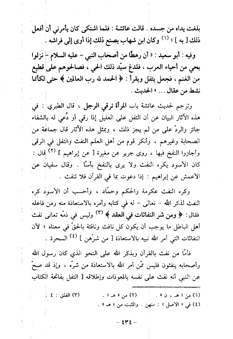 بَلَغَتْ يَدَاهُ مِنْ جَسَدِهِ) ، قَالَتْ عَائِشَةُ: فَلَمَّا اشْتَكَى، كَانَ يَأْمُرُنِى أَنْ أَفْعَلَ ذَلِكَ بِهِ. وَكَانَ ابْنَ شِهَابٍ يَصْنَعُ ذَلِكَ إِذَا أَوَى إِلَى فِرَاشِه. ِ / 53 - وفيه: أَبُو سَعِيدٍ، أَنَّ رَهْطًا مِنْ أَصْحَابِ النَّبِىّ عليه السلام نَزَلُوا بِحَىٍّ مِنْ أَحْيَاءِ الْعَرَبِ فَلُدِغَ سَيِّدُ ذَلِكَ الْحَىِّ، فَصَالَحُوهُمْ عَلَى قَطِيعٍ مِنَ الْغَنَمِ، فَجَعَلَ يَتْفُلُ وَيَقْرَأُ: (الْحَمْدُ لِلَّهِ رَبِّ الْعَالَمِينَ (، حَتَّى لَكَأَنَّمَا نُشِطَ مِنْ عِقَالٍ. . . الحديث. وترجم لحديث عائشة باب المرأة ترقى الرجل. قال الطبرى: فى هذه الآثار البيان عن أن التفل على العليل إذا رقى أو دعى له بالشفاء جائز والرد على من لم يجز ذلك، وبمثل هذه الآثارقال جماعة من الصحابة وغيرهم، وأنكر قوم من أهل العلم النفث والتفل فى الرقى وأجازوا النفخ فيها، روى جرير عن مغيره عن إبراهيم قال: كان الأسود يكره النفث ولا يرى بالنفخ بأسًا. وقال سفيان عن الأعمش عن إبراهيم: إذا دعوت بما فى القرآن فلا تنفث. وكره النفث عكرمة والحكم وحماد، وأحسب أن السود كره النفث لذكر الله تعالى له فى كتابه وأمره بالاستعاذة منه ومن فاعله فقال: (ومن شر النفاثات فى العقد) وليس فى ذمة تعالى نفث أهل الباطل مايوجب أن يكون كل نافث ونافثة بالحق فى معناه؛ لأن النفاثات التى أمر الله نبيه بالاستعاذة من شرهن السحرة. فأما من نفث بالقرآن وبذكر الله على النحو الذى كان رسول الله وأصحابه ينفثون فليس ممن أمر الله بالاستعاذة من شره، وإذ قد صح عن النبى أنه نفث على نفسه بالمعوذات وإطلاقه التفل بفاتحة الكتاب
