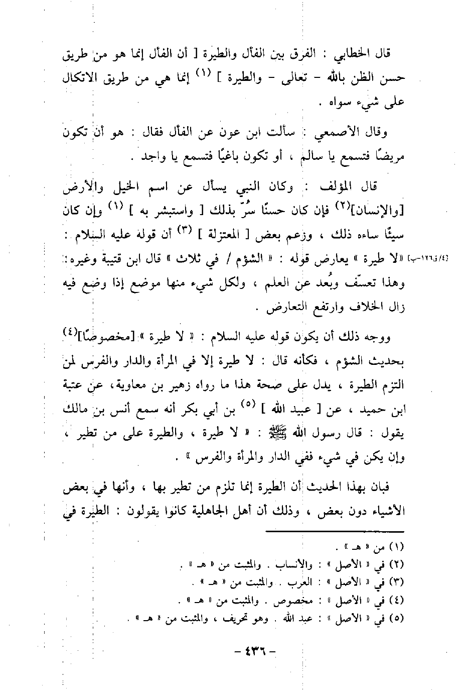 وقال الأصمعى: سألت ابن عون عن الفأل فقال: هو أن تكون مريضًا فتسمع يا سالم، أو تكون باغيا فتسمع يا واجد. قال المؤلف: وكان النبى يسأل عن اسم الخيل والأرض والإنسان فإن كان حسنًا سر بذلك واستبشر به وإن كان سيئًا ساء ذلك، وزعم بعض المعتزلة أن قوله عليه السلام: (لا طيرة) يعارض قوله: (الشئوم فى ثلاث) قال ابن قتيبة وغيره: وهذا تعسف وبعد عن العلم، ولكل شىء منها موضع إذا وضع فيه زال الخلاف وارتفع التعارض. ووجه ذلك أن يكون قوله عليه السلام: (لا طيرة) مخصوصًا بحديث الشؤم، فكأنه قال: لاطيرة إلا فى المرأة والدار والفرس لمن التزم الطيرة، يدل على صحة هذا مارواه زهير بن معاوية، عن عتبة ابن حميد، عن عبيد الله بن أبى بكر أنه سمع أنس بن مالك يقول: قال رسول الله (صلى الله عليه وسلم) : (لا طيرة، والطيرة على من تطير، وإن يكن فى شىء ففى الدار والمرأة والفرس) . فبان بهذا الحديث أن الطيرة إنما تلزم من تطير بها، وأنها فى بعض الأشياء دون بعض، وذلك أن أهل الجاهلية كانوا يقولون: الطيرة في