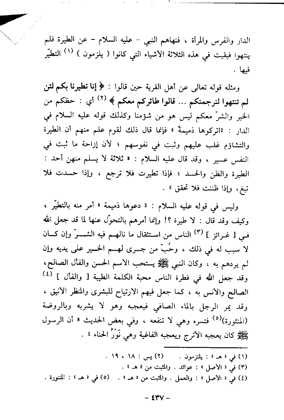 الدار والفرس والمرأة، فهناهم النبى عليه السلام عن الطيرة فلم ينتهوا فبقيت فى هذه الثلاثة الشياء التى كانوا يلزمون التطير فيها. ومثله قوله تعالى عن أهل القرية حين قالوا: (إنا تطيرنا بكم لئن لم تنتهوا لنرجمنكم. . . قالوا طائركم معكم) أى: حظكم من الخير والشر معكم ليس هو من شؤمنا وكذلك قوله عليه السلام فى الدار: (اتركوها ذميمة) فإنما قال ذلك لقوم علم منهم أن الطيرة والتشاؤم غلب عليهم وثبت فى نفوسهم؛ لأن ازاحة مايثبت فى النفس عسير، وقد قال عليه السلام: (ثلاثة لا يسلم منهن أحد: الطيرة والظن والحسد؛ فإذا تطيرت فلا ترجع، وإذا حسدت فلا تبغ، وإذا ظننت فلا تحقق) . وليس فى قوله عليه السلام: (دعوها ذميمة) أمر منه بالتطير، وكيف وقد قال: لايطرة؟ وإنما أمرهم بالتحول عنها لما قد جعل الله فى غرائز الناس من استثقال مانالهم فيه الشر وإن كان لاسبب له فى ذلك، وحب من جرى لهم الخير على يديه وإن لم يردهم به، وكان النبى عليه السلام يستحب الاسم الحسن والفأل الصالح، وقد جعل الله فى فطرة الناس محبة الكلمة الطيبة والفأل الصالح والأنس به، كما جعل فيهم الارتياح للبشرى والمنظر الأنيق، وقد يمر الرجل بالماء الصافى فعجبه وهو لايشربه وبالروضه المنثورة فتسره وهي لاتنفعه، وفى بعض الحديث (أن الرسول عليه السلام كان يعجبه الأترج ويعجبه الفغية وهي نور الحناء) .