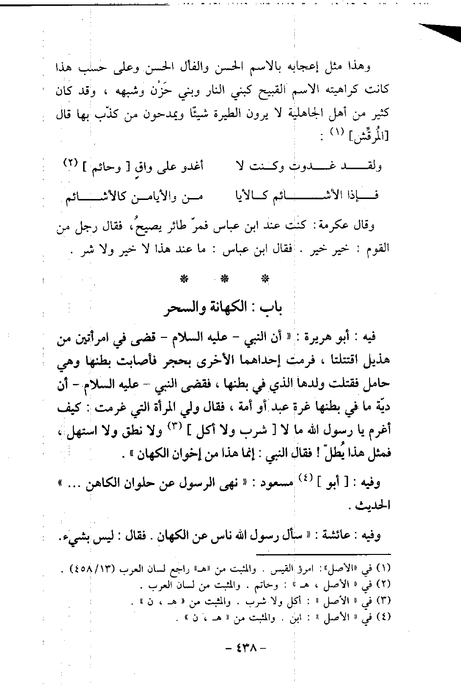 / 58 - فيه: أَبُو هُرَيْرَةَ، أَنَّ النَّبِىّ عليه السلام قَضَى فِى امْرَأَتَيْنِ مِنْ هُذَيْلٍ اقْتَتَلَتَا، فَرَمَتْ إِحْدَاهُمَا الأخْرَى بِحَجَرٍ، فَأَصَابَ بَطْنَهَا، وَهِىَ حَامِلٌ، فَقَتَلَتْ وَلَدَهَا الَّذِى فِى بَطْنِهَا، فَاخْتَصَمُوا إِلَى النَّبِى (صلى الله عليه وسلم) ، فَقَضَى أَنَّ دِيَةَ مَا فِى بَطْنِهَا غُرَّةٌ عَبْدٌ أَوْ أَمَةٌ، فَقَالَ وَلِى الْمَرْأَةِ الَّتِى غَرِمَتْ: كَيْفَ أَغْرَمُ يَا رَسُولَ اللَّهِ مَنْ لا شَرِبَ، وَلا أَكَلَ، وَلا نَطَقَ، وَلا اسْتَهَلَّ، فَمِثْلُ ذَلِكَ يُطَلُّ؟ فَقَالَ النَّبِى (صلى الله عليه وسلم) : (إِنَّمَا هَذَا مِنْ إِخْوَانِ الْكُهَّانِ) . / 59 - وفيه: أَبُو مَسْعُود نَهَى الرسول عليه السلام عَنْ حُلْوَانِ الْكَاهِنِ. . . . . الحديث. / 60 - وفيه: عَائِشَةَ، سَأَلَ رَسُولَ اللَّهِ عليه السلام نَاسٌ عَنِ الْكُهَّانِ، فَقَالَ: (لَيْسَ بِشَيْءٍ) ،