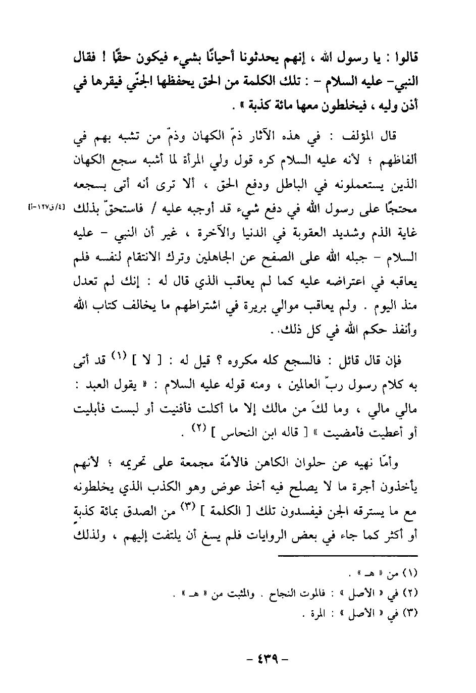 قَالُوا: يَا رَسُولَ اللَّهِ إِنَّهُمْ يُحَدِّثُونَا أَحْيَانًا بِشَىْءٍ، فَيَكُونُ حَقًّا، فَقَالَ النَّبِىّ (صلى الله عليه وسلم) : (تِلْكَ الْكَلِمَةُ مِنَ الْحَقِّ، يَخْطَفُهَا الْجِنِّىِّ، فَيَقُرُّهَا فِى أُذُنِ وَلِيِّهِ، فَيَخْلِطُونَ مَعَهَا مِائَةَ كَذْبَةٍ) . قال المؤلف: فى هذه الآثار ذم الكهان وذم من تشبه بهم فى ألفاظهم؛ لأنه عليه السلام كره قول ولى المرأة لما أشبه سجع الكهان الذين يستعملونه فى الباطل ودفع الحق، ألا ترى أنه أتى بسجعه محتجًا على رسول الله فى دفع شىء قد أوجبه عليه فاستحق بذلك غاية الذم وشديد العقوبة فى الدنيا والآخرة، غير أن النبى عليه السلام جبله الله على الصفح عن الجاهلين وترك الانتقام لنفسه فلم يعاقبه فى اعتراضه عليه كما لم يعاقب الذى قال له: إنك لم تعدل منذ اليوم. ولم يعاقب موالى بريرة فى اشتراطهم مايخالف كتاب الله وأنفذ حكم الله فى كل ذلك. فإن قال قائل: فالسجع كله مكروه؟ قيل له: لا قد أتى به كلام رسول رب العالمين، ومنه قوله عليه السلام: (يقول العبد: ما لى ما لى، وما لك من مالك إلا ما أكلت فأفنيت، أو لبست فأبليت، أو أعطيت فأمضيت) قاله ابن النحاس. وأما نهيه عن حلوان الكاهن فالأمة مجمعة على تحريمه؛ لأنهم يأخذون أجره مالا يصلح فيه أخذ عوض وهو الكذب الذى يخلطونه مع مايسترقه الجن فيفسدون تلك الكلمة من الصدق بمائة كذبة أو أكثر كما جاء فى بعض الروايات فلم يسغ أن يلتفت اليهم، ولذلك قال