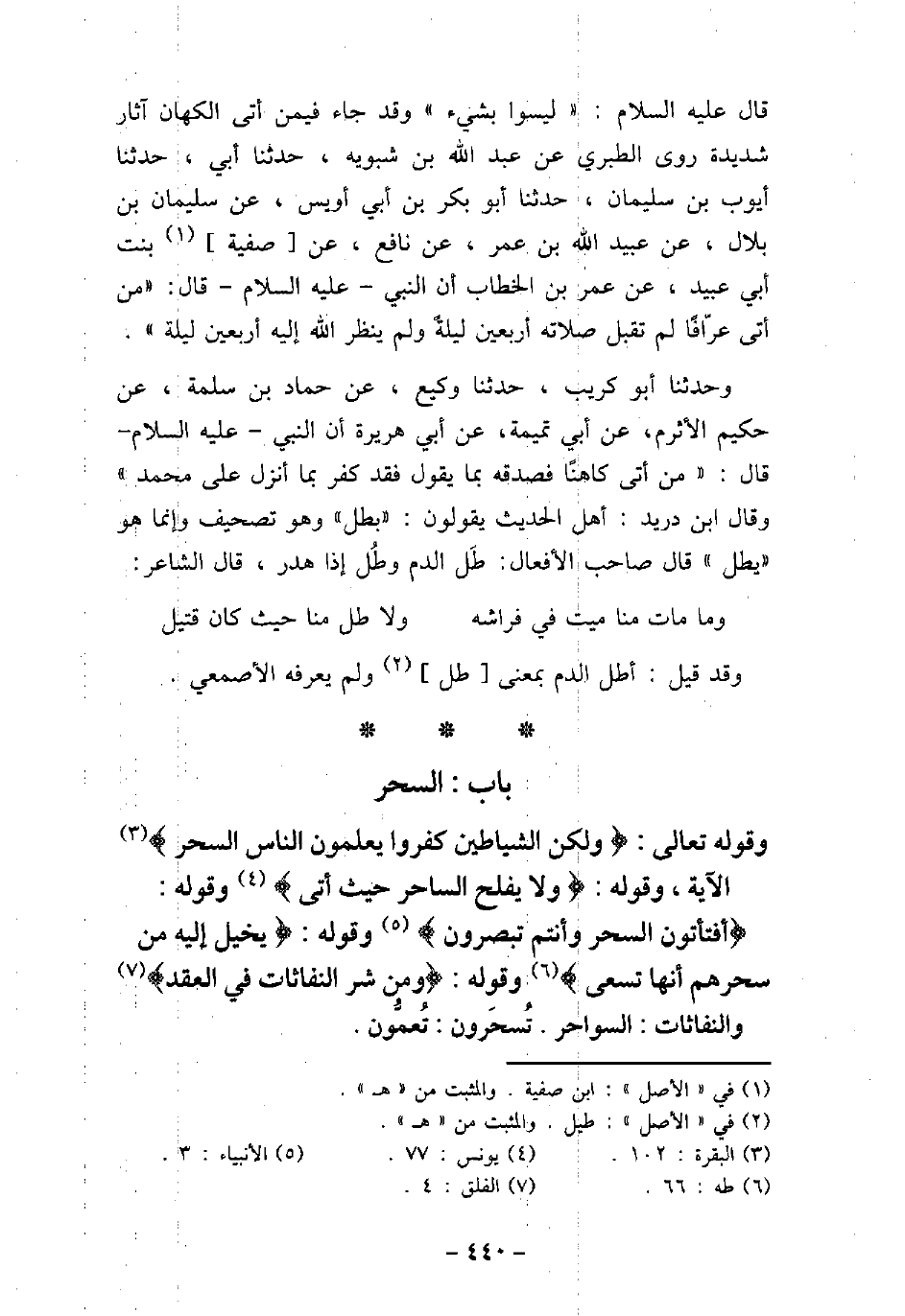 وَقَوْلِ اللَّهِ تَعَالَى: (وَلَكِنَّ الشَّيَاطِينَ كَفَرُوا يُعَلِّمُونَ النَّاسَ السِّحْرَ (الآية [البقرة: 102] ، وَقَوْلِهِ تَعَالَى: (وَلا يُفْلِحُ السَّاحِرُ حَيْثُ أَتَى (، وَقَوْلِهِ: (أَفَتَأْتُونَ السِّحْرَ وَأَنْتُمْ تُبْصِرُونَ) [طه: 20] وَقَوْلِهِ: (يُخَيَّلُ إِلَيْهِ مِنْ سِحْرِهِمْ أَنَّهَا تَسْعَى) [طه: 66] وَقَوْلِهِ: (وَمِنْ شَرِّ النَّفَّاثَاتِ فِى الْعُقَدِ (وَالنَّفَّاثَاتُ: السَّوَاحِرُ، تُسْحَرُونَ: تُعَمَّوْنَ.