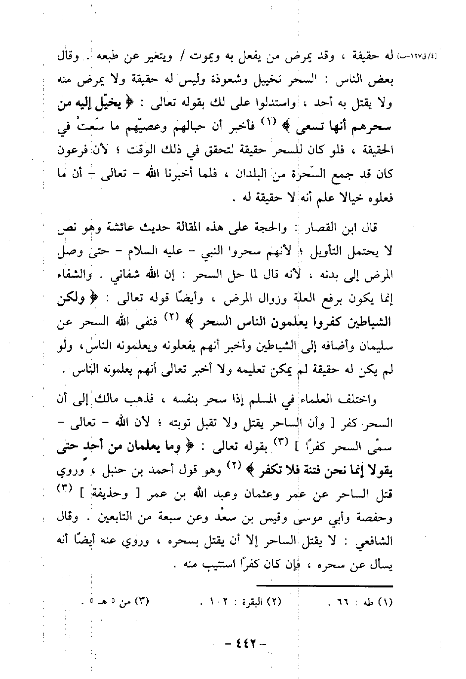 له حقيقة، وقد يمرض من يفعل ويموت ويتغير عن طبعه. وقال بعض الناس: السحر تخييل وشعوذة وليس له حقيقة ولايمرض منه ولايقتل به أحد، واستدلوا على لك بقوله تعالى: (يخيل إليه من سحرهم أنها تسعى) فأخبر أن حبالهم وعصيهم ماسعت فى الحقيقة، فلو كان للسحر حقيقة لتحقق فى ذلك الوقت؛ لأن فرعون كان قد جمع السحرة من البلدان، فلما أخبرنا الله تعالى أن ما فعلوه خيالا علم لا حقيقة له. قال ابن القصار: والحجة على هذه المقالة حديث عائشة وهو نص لا يحتمل التأويل؛ لأنهم سحروا النبى عليه السلام حتى وصل المرض إلى بدنه، لأنه قال لما حل السحر: إن الله شفانى. والشفاء إنما يكون برفع العلة وزوال المرض، وأيضًا قوله تعالى: (ولكن الشياطين كفروا يعلمون الناس السحر) فنفى الله السحر عن سليمان وأضافة إلى الشياطين وأخبر أنهم يعلمونه الناس. واختلف العلماء فى المسلم إذا سحر بنفسه، فذهب مالك إلى أن السحر كفر وأن الاسحر يقتل ولاتقبل توبته؛ لأن الله - تعالى سمى السحر كفرًا بقوله تعالى: (وما يعلمان من أحد حتى يقولا إنما نحن فتنة فلا تكفر) وهو قول أحمد بن حنبل، وروى قتل الساحر عن عمر وعثمان وعبد الله بن عمر، وحذيفة، وحفصة، وأبى موسى، وقيس بن سعد، وعن سبعة من التابعين. وقال الشافعى: لا يقتل الساحر إلا أن يقتل بسحره، وروى عنه أيضا أنه يسأل عن سحره، فإن كان كفرًا استتيب منه.