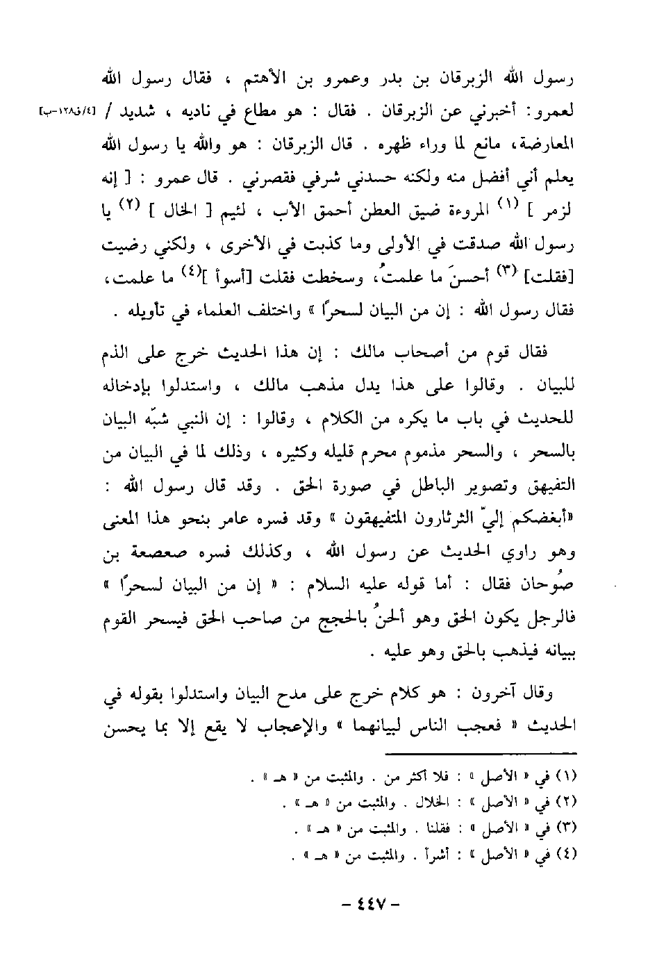 رسول الله الزبرقان بن بدر وعمر بن الأهتم، فقال رسول الله لعمرو: أخبرنى عن الزبرقان. فقال: هو مطاع فى ناديه، شديد المعارضة، مانع لما وراء ظهره. قال الزبرقان: هو والله يارسول الله يعلم أنى أفضل منه ولكنه حسدنى شرفى فقصرنى. قال عمرو: إنه لزمر المروءة ضيق العطن أحمق الأب، لئيم الخال يارسول الله صدقت فى الأولى وماكذبت فى الأخرى، ولكنى رضيت فقلت أحسن ماعلمت، وسخطت فقلت أسوأ ماعلمت، فقال رسول الله: إن من البيان لسحرًا) ، واختلف العلماء فى تأويله. فقال قوم من أصحاب مالك: إن هذا الحديث خرج على الذم للبيان. وقالوا على هذا يدل مذهب مالك، واستدلوا بإدخاله للحديث فى باب مايكره من الكلام، وقالوا: إن النبى شبه البيان بالسحر، والسحر مذموم محرم قليله وكثيره وذلك لما فى البيان من التفيهق وتصوير الباطل فى صورة الحق. وقد قال رسول الله: (أبغضكم إلىّ الثرثارون المتفيهقون) وقد فسره عامر بنحو هذا المعنى وهو رواه الحديث عن رسول الله، وكذلك فسره صعصعة بن صوحان فقال: أما قوله عليه السلام: (إن من البيان لسحرًا) فالرجل يكون الحق وهو ألحن بالحجج من صاحب الحق فيسحر القوم ببيانه فيذهب بالحق وهو عليه. وقال آخرون: هو كلام خرج على مدح البيان واستدلوا بقوله فى الحديث: (فعجب الناس لبيانها) والإعجاب لايقع إلا بما يحسن