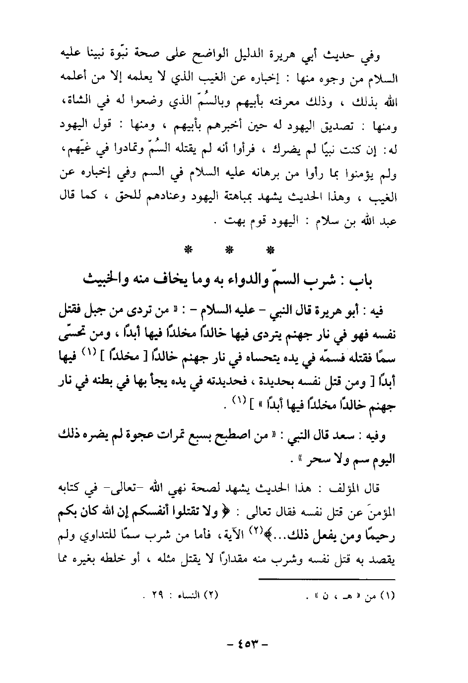 / 67 - فيه: أَبُو هُرَيْرَةَ، قَالَ النَّبِى (صلى الله عليه وسلم) : (مَنْ تَرَدَّى مِنْ جَبَلٍ، فَقَتَلَ نَفْسَهُ، فَهُوَ فِى نَارِ جَهَنَّمَ، يَتَرَدَّى فِيهِ خَالِدًا مُخَلَّدًا فِيهَا أَبَدًا، وَمَنْ تَحَسَّى سُمًّا، فَقَتَلَ نَفْسَهُ، فَسُمُّهُ فِى يَدِهِ يَتَحَسَّاهُ فِى نَارِ جَهَنَّمَ خَالِدًا مُخَلَّدًا فِيهَا أَبَدًا، وَمَنْ قَتَلَ نَفْسَهُ بِحَدِيدَةٍ، فَحَدِيدَتُهُ فِى يَدِهِ، يَجَأُ بِهَا فِى بَطْنِهِ فِى نَارِ جَهَنَّمَ خَالِدًا مُخَلَّدًا فِيهَا أَبَدًا) . / 68 - وفيه: سَعْد، قَالَ النَّبِىّ (صلى الله عليه وسلم) : (مَنِ اصْطَبَحَ بِسَبْعِ تَمَرَاتِ عَجْوَةٍ، لَمْ يَضُرُّهُ ذَلِكَ الْيَوْمَ سَمٌّ وَلا سِحْرٌ) . قال المؤلف: هذا الحديث يشهد لصحة نهى الله تعالى فى كتابه المؤمن عن قتل نفسه فقال تعالى: (ولا تقتلوا أنفسكم إن الله كان بكم رحيمًا ومن يفعل ذلك) الآية، فأما من شرب سمًا للتداوى ولم يقصد به قتل نفسه وشرب منه مقدرًا مثله، أو خلطه بغيره مما يكسر