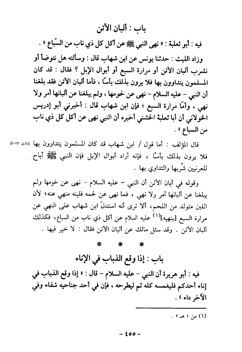 / 69 - فيه: أَبُو ثَعْلَبَة، نَهَى النَّبِى عليه السلام عَنْ أَكْلِ كُلِّ ذِى نَابٍ مِنَ السَّبُعِ. وَزَادَ اللَّيْثُ، حَدَّثَنَا يُونُسُ، عَنِ ابْنِ شِهَابٍ، قَالَ: وَسَأَلْتُهُ هَلْ نَتَوَضَّأُ، أَوْ نَشْرَبُ أَلْبَانَ الأتُنِ، أَوْ مَرَارَةَ السَّبُعِ، أَوْ أَبْوَالَ الإبِلِ، قَالَ: قَدْ كَانَ الْمُسْلِمُونَ يَتَدَاوَوْنَ بِهَا، فَلا يَرَوْنَ بِذَلِكَ بَأْسًا، فَأَمَّا أَلْبَانُ الأتُنِ، فَقَدْ بَلَغَنَا أَنَّ النَّبِىّ (صلى الله عليه وسلم) نَهَى عَنْ لُحُومِهَا، وَلَمْ يَبْلُغْنَا عَنْ أَلْبَانِهَا أَمْرٌ وَلا نَهْيٌ، وَأَمَّا مَرَارَةُ السَّبُعِ، قَالَ ابْنُ شِهَابٍ: أَخْبَرَنِى أَبُو إِدْرِيسَ الْخَوْلانِىُّ أَنَّ أَبَا ثَعْلَبَةَ الْخُشَنِىَّ أَخْبَرَهُ أَنَّ النَّبِىّ (صلى الله عليه وسلم) نَهَى عَنْ أَكْلِ كُلِّ ذِى نَابٍ مِنَ السَّبُعِ. قال المؤلف: أما قول ابن شهاب قد كان المسلمون يتداوون بها فلا يرون بذلك باسًا، فإنه اراد أبوال الإبل فإن النبى عليه السلام أباح للعرنيين شربها والتداوى بها. وقوله فى أبان الأتن أن النبى عليه السلام نهى عن لحومها ولم يبلغنا عن البانها أمر ولا نهى، فما نهى عن لحمه فلبنه منهى عنه؛ لأن اللبن متولد من اللحم، ألا ترى أنه استدل ابن شهاب على النهى عن مرارة السبع بنهيه عليه السلام عن أكل ذى ناب من السباع، فكذلك ألبان الأتن. وقد سئل مالك عن ألبان الأتن فقال: لاخير فيها.