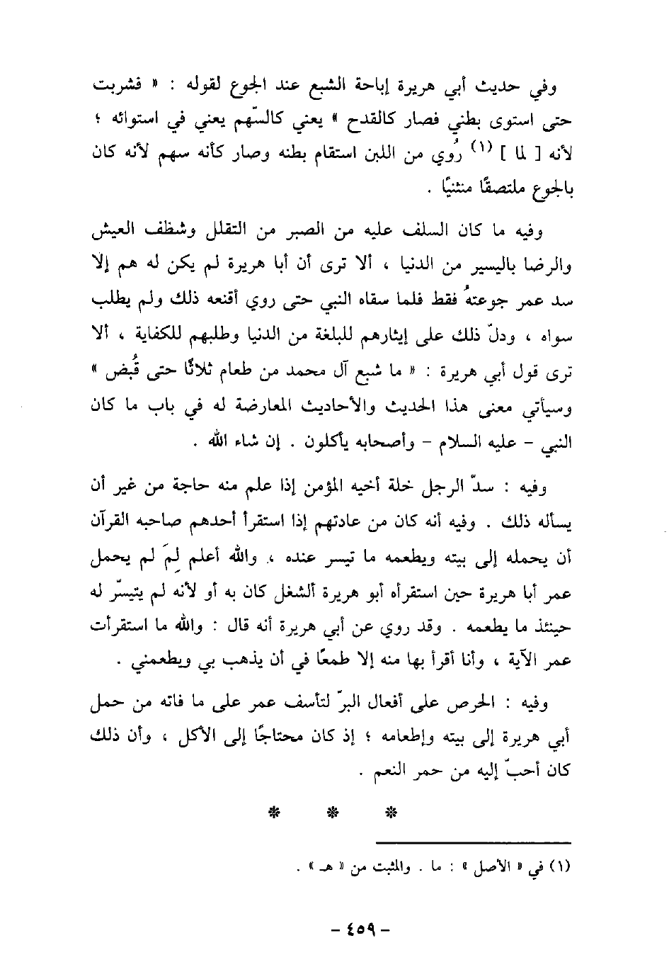 وفي حديث أبي هريرة إباحة الشبع عند الجوع لقوله: (فشربت حتى استوى بطنى فصار كالقدح) يعنى كالسهم يعنى فى استوائه؛ لأنه لما روى من اللبن استقام بطنه وصار كأنه سهم لأنه كان بالجوع ملتصقًا منثنيًا. وفيه: ماكان السلف عليه من الصبر من التقلل وشظف العيش والرضا ياليسير من الدنيا، ألا ترى أن أبا هريرة لم يكن له هم إلا سد عمر جوعته فقط فلما سقاه النبى حتى روى أقنعه ذلك ولم يطلب سواه، ودل ذلك على إيثارهم للبلغة من الدنيا وطلبهم للكفاية، ألا ترى قول أبى هريرة: (ما شبع آل محمد من طعام ثلاثًا حتى قبض) وسيأتى معنى هذا الحديث والآحاديث المعارضة له فى باب ماكان النبى عليه السلام وأصحابه يأكلون، إن شاء الله. وفيه: سد الرجل خله أخيه المؤمن إذا علم منه حاجة من غير أن يسأله ذلك. وفيه أنه كان من عادتهم إذا استقر أحدهم صاحبه القرآن أن يحمله إلى بيته ويطعمه ماتيسر عنده، والله أعلم لم لم يحمل عمر أبا هريرة حين استقرأه أبو هريرة ألشغل كان به أو لأنه لم يتيسر له حيئذ مايطعمه. وقد روى عن أبى هريرة أنه قال: والله مااستقرأت عمر الآية، وأنا أقأ بها منه إلا طعمًا فى أن يذهب بى ويطعمنى. وفيه: الحرص على أفعال البر لتأسف عمر على مافاته من حمل أبى هريرة إلى بيته وإطعامة؛ إذ كان محتاجًا إلى الأكل، وأن ذلك كان أحب اليه من حمر النعم.