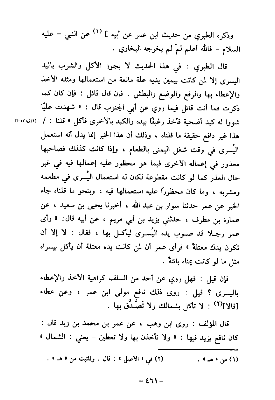 وذكره الطبري من حديث ابن عمر عن أبيه عن النبى عليه السلام فالله أعلم لم لم يخرجه البخارى. قال الطبرى: فى هذا الحديث لايجوز الأكل والشرب باليد اليسرى إلا لمن كانت بيمين عله مانعة من استعمالها ومثله الأخذ والإعطاء بها والرفع والوضع والبطش. فإن قال قائل: (شهدت عليًا شوررا له كبد أضحية فأخذ رغيفًا بيده والكبد بالأخرى فأكل) قلنا: هذا غير دافع حقيقة ما قلناه، وذلك أن هذا الخبر إنما يدل أنه استعمل اليسرى فى وقت شغل اليمنى بالطعام، وإذا كانت كذلك فصاحبها معذور فى إعماله الأخرى فيما هو محظور عليه إعمالها فيه فى غير حال العذر كما لو كانت مقطوعة لكان له استعمال اليسرى فى مطعمه ومشربه، وماكان محظورًا عليه استعمالها فيه، وبنحو ماقلناه جاء الخبر عن عمر حدثنا سوار بن عبد الله، أخربنا يحى بن سعيد، عنعمارة بن مطرف، حدثنى يزيد بن أبى مريم، عن أبيه قال: (رأى عمر رجلا قد صوب يده اليسرى ليأكل بها، فقال: لا إلا أن تكون يدك معتلة) فرأى عمر أن لمن كانت يده معتلة أن يأكل بيسراه مثل ما لو كانت يمناه بائنة. فإن قيل: فهل روى عن أحد من السلف كراهية الأخذ والإعطاء باليسرى؟ قيل: روى ذلك نافع مولى ابن عمر، وعن عطاء قالا لاتأكل بشمالك ولاتصدق بها. قال المؤلف: روى ابن وهب، عن عمر بن محمد بن زيد قال: كان نافع يزيد فيها: (ولا تأخذن بها ولاتعطين - يعني: الشمال) .