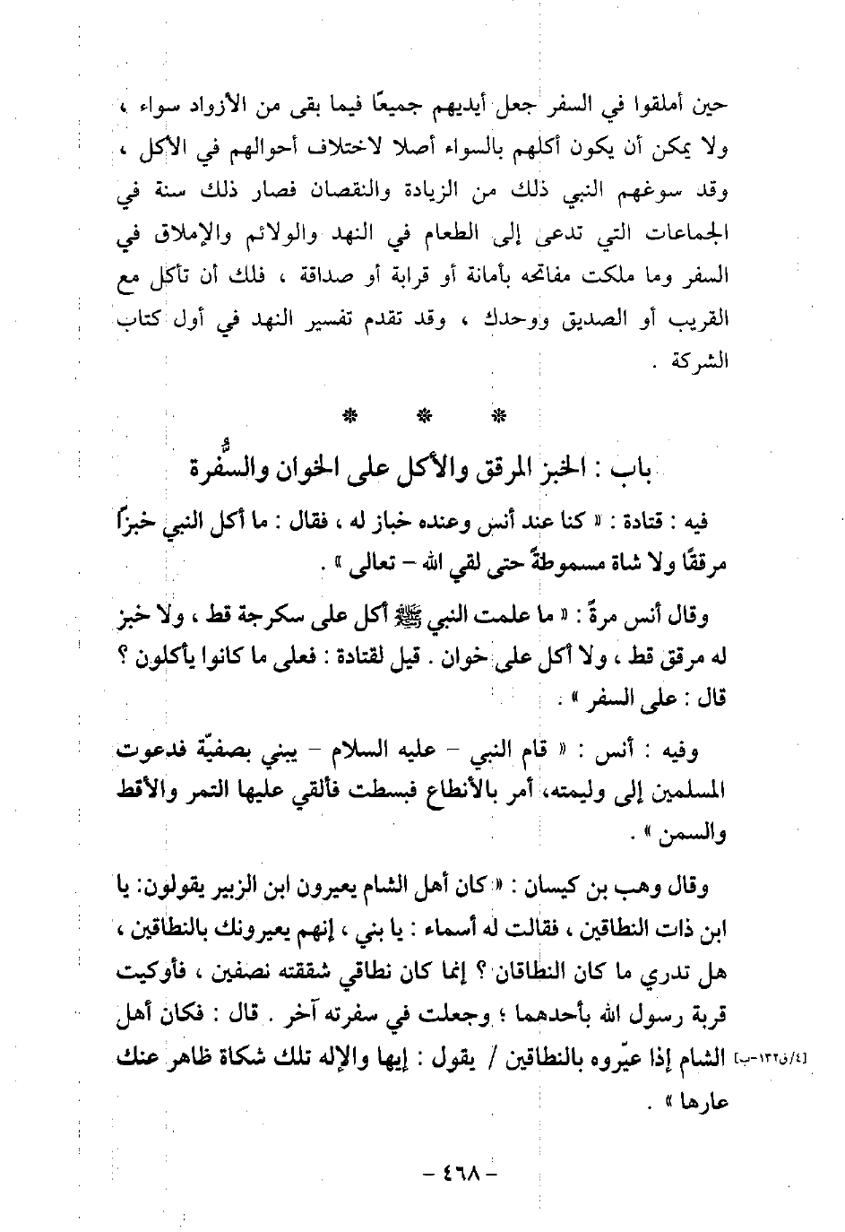 / 11 - فيه: قَتَادَةَ، كُنَّا عِنْدَ أَنَسٍ وَعِنْدَهُ خَبَّازٌ لَهُ، فَقَالَ: مَا أَكَلَ النَّبِىُّ عليه السلام خُبْزًا مُرَقَّقًا وَلا شَاةً مَسْمُوطَةً حَتَّى لَقِىَ اللَّهَ تَعَالَى. / 12 - وَقَالَ أَنَس مرة: مَا عَلِمْتُ النَّبِى عليه السلام أَكَلَ عَلَى سُكْرُجَةٍ قَطُّ، وَلا خُبِزَ لَهُ مُرَقَّقٌ قَطُّ، وَلا أَكَلَ عَلَى خِوَانٍ قَطُّ، قِيلَ لِقَتَادَة: فَعَلامَ كَانُوا يَأْكُلُونَ؟ قَالَ: عَلَى السُّفَرِ. / 13 - وفيه: أَنَس، قَامَ النَّبِى عليه السلام يَبْنِى بِصَفِيَّةَ، فَدَعَوْتُ الْمُسْلِمِينَ إِلَى وَلِيمَتِهِ، أَمَرَ بِالأنْطَاعِ فَبُسِطَتْ، فَأُلْقِى عَلَيْهَا التَّمْرُ وَالأقِطُ وَالسَّمْنُ. / 14 - وَقَالَ وَهْبِ بْنِ كَيْسَانَ: كَانَ أَهْلُ الشَّأْمِ يُعَيِّرُونَ ابْنَ الزُّبَيْرِ، يَقُولُونَ: يَا ابْنَ ذَاتِ النِّطَاقَيْنِ، فَقَالَتْ لَهُ أَسْمَاءُ: يَا بُنَىَّ، إِنَّهُمْ يُعَيِّرُونَكَ بِالنِّطَاقَيْنِ، هَلْ تَدْرِى مَا كَانَ النِّطَاقَانِ؟ إِنَّمَا كَانَ نِطَاقِى شَقَقْتُهُ نِصْفَيْنِ، فَأَوْكَيْتُ قِرْبَةَ رَسُولِ اللَّهِ (صلى الله عليه وسلم) بِأَحَدِهِمَا، وَجَعَلْتُ فِى سُفْرَتِهِ آخَرَ، قَالَ: فَكَانَ أَهْلُ الشَّأْمِ إِذَا عَيَّرُوهُ بِالنِّطَاقَيْنِ، يَقُولُ: إِيهًا وَالإلَهِ (تِلْكَ شَكَاةٌ ظَاهِرٌ عَنْكَ عَارُهَا) .