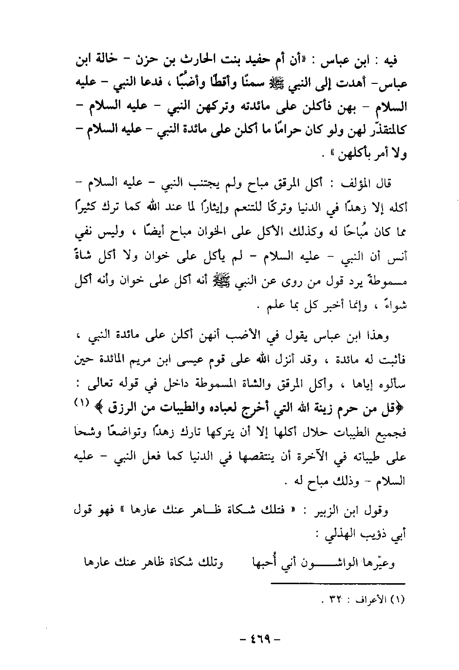 / 15 - فيه: ابْن عَبَّاس، أَنَّ أُمَّ حُفَيْدٍ بِنْتَ الْحَارِثِ بْنِ حَزْنٍ - خَالَةَ ابْنِ عَبَّاسٍ - أَهْدَتْ إِلَى النَّبِى عليه السلام سَمْنًا وَأَقِطًا وَأَضُبًّا، فَدَعَا بِهِنَّ، فَأُكِلْنَ عَلَى مَائِدَتِهِ، وَتَرَكَهُنَّ النَّبِى عليه السلام كَالْمُسْتَقْذِرِ لَهُنَّ، وَلَوْ كُنَّ حَرَامًا مَا أُكِلْنَ عَلَى مَائِدَةِ النَّبِى (صلى الله عليه وسلم) وَلا أَمَرَ بِأَكْلِهِنَّ. قال المؤلف: أكل المرقق مباح ولم يجتنب النبى عليه السلام أكله إلا زهدًا فى الدنيا وتركًا للتنعيم وإيثارًا عند الله كما ترك كثيرًا مما كان مباحًا له وكذلك الأكل على الخوان مباح أيضًا، وليس نفى أنس أن النبى عليه السلام لم يأكل على خوان ولا أكل شاة مسموطة يرد قول من روى عن النبى عليه السلام أنه أكل على خوان وأنه أكل شواء، وإنما أخبر كل بما علم. وهذا ابن عباس يقول فى الأضب أنهن أكلن على مائدة النبى، فأثبت له مائدة، وقد أنزل الله على قوم عيسى ابن مريم المائدة حين سألوه إياها، وأكل المرقق والشاة المسموطة داخل فى قوله تعالى: (قل من حرم زينة الله التى أخرج لعباده والطيبات من الرزق) فجميع الطيبات حلال أكلها إلا أن يتركها تارك زهدًا وتوضعًا وشحًا على طيباته فى الآخرة أن ينتقصها فى الدنيا كما فعل النبى عليه السلام وذلك مباح له. وقول ابن الزبير: (فتلك شكاة ظاهر عنك عارها) فهو قول أبى ذؤيب الهذلى: وعيرها الواشون أني أحبها