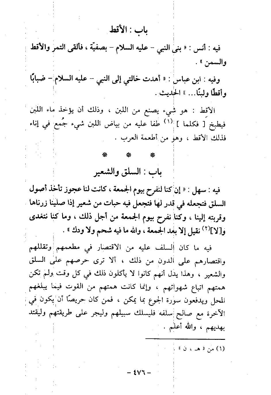 / 26 - فيه: سَهْل، إِنْ كُنَّا لَنَفْرَحُ بِيَوْمِ الْجُمُعَةِ، كَانَتْ لَنَا عَجُوزٌ تَأْخُذُ أُصُولَ السِّلْقِ، فَتَجْعَلُهُ فِى قِدْرٍ لَهَا، فَتَجْعَلُ فِيهِ حَبَّاتٍ مِنْ شَعِيرٍ، إِذَا صَلَّيْنَا زُرْنَاهَا، فَقَرَّبَتْهُ إِلَيْنَا، وَكُنَّا نَفْرَحُ بِيَوْمِ الْجُمُعَةِ مِنْ أَجْلِ ذَلِكَ، وَمَا كُنَّا نَتَغَدَّى وَلا نَقِيلُ إِلا بَعْدَ الْجُمُعَةِ، وَاللَّهِ مَا فِيهِ شَحْمٌ وَلا وَدَكٌ. فيه ماكان السلف عليه من الاقتصار فى مطعمهم وتقللهم واقتصارهم على الدون من ذلك، ألا ترى حرصهم على السلق والشعير، وهذا يدل أنهم كانوا لايأكلون ذلك فى كل وقت ولم تكن همتهم اتباع شهواتهم، وإنما كانت همتهم من القوت فيما يبلغهم المحل ويدفعون سورة الجوع بما يمكن، فمن كان حريصًا أن يكون فى الآخرة مع صالح سلفه فليسلك سبيلهم وليجر على طريقتهم وليقتد بهديهم، والله أعلم.