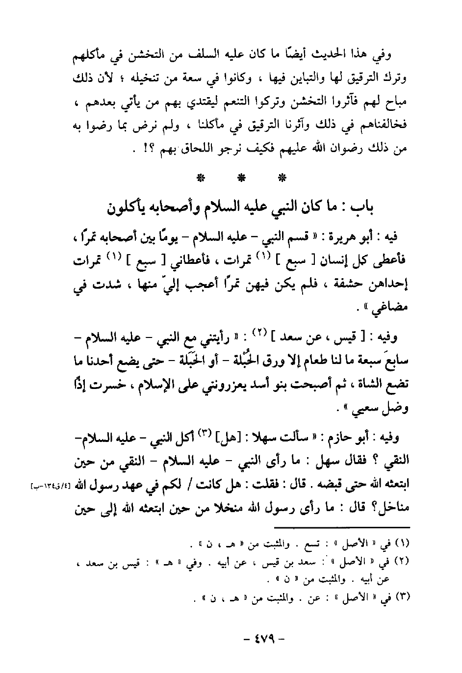 / 32 - فيه: أَبُو هُرَيْرَةَ، قَسَمَ النَّبِى عليه السلام يَوْمًا بَيْنَ أَصْحَابِهِ تَمْرًا، فَأَعْطَى كُلَّ إِنْسَانٍ سَبْعَ تَمَرَاتٍ، فَأَعْطَانِى سَبْعَ تَمَرَاتٍ إِحْدَاهُنَّ حَشَفَةٌ، فَلَمْ يَكُنْ فِيهِنَّ تَمْرَةٌ أَعْجَبَ إِلَىَّ مِنْهَا، شَدَّتْ فِى مَضَاغِى. / 33 - وفيه: قَيْسٍ، عَنْ سَعْدٍ، رَأَيْتُنِى مَعَ النَّبِىِّ، عليه السَّلام، سابع سبعة، مَا لَنَا طَعَامٌ إِلا وَرَقُ الْحُبْلَةِ - أَوِ الْحَبَلَةِ - حَتَّى يَضَعَ أَحَدُنَا مَا تَضَعُ الشَّاةُ، ثُمَّ أَصْبَحَتْ بَنُو أَسَدٍ تُعَزِّرُنِى عَلَى الإسْلامِ خَسِرْتُ إِذًا وَضَلَّ سَعْىِ. / 34 - وفيه: أَبُو حَازِم، سَأَلْتُ سَهْلاً، هَلْ أَكَلَ النَّبِىّ عليه السلام النَّقِيَّ؟ فَقَالَ سَهْلٌ: مَا رَأَى رَسُولُ اللَّهِ عليه السلام النَّقِى مِنْ حِينَ ابْتَعَثَهُ اللَّهُ حَتَّى قَبَضَهُ اللَّهُ، قَالَ: فَقُلْتُ: هَلْ كَانَتْ لَكُمْ فِى عَهْدِ رَسُولِ اللَّهِ عليه السلام مَنَاخِلُ؟ قَالَ: مَا رَأَى رَسُولُ اللَّهِ عليه السلام مُنْخُلا مِنْ حِينَ ابْتَعَثَهُ اللَّهُ حَين