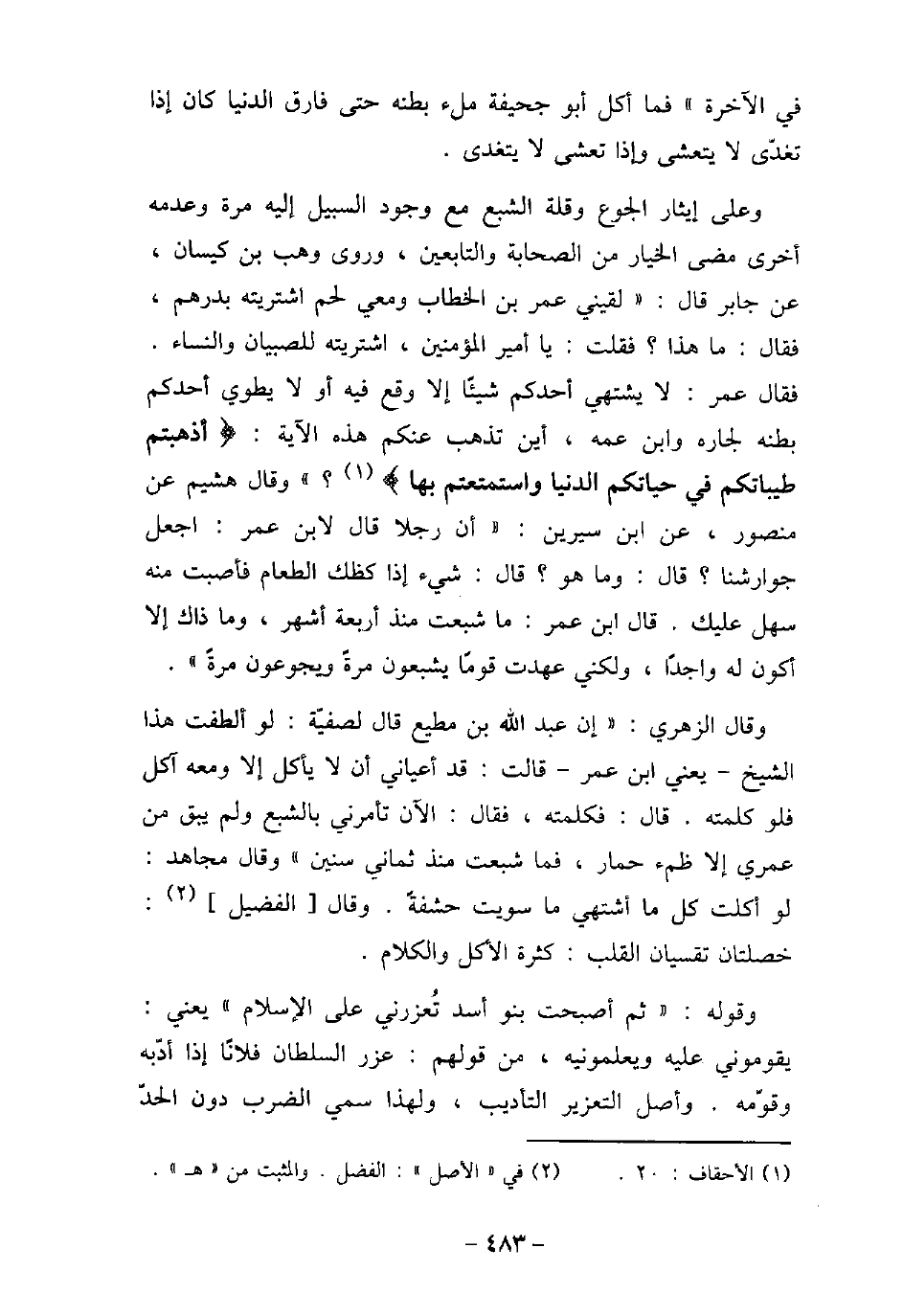 في الآخرة) وروى أسد ابن موسى من حديث عون بن أبى جحيفة عن أبيه قال: (أكلت ثريدة بر بلحم سمين، فأتيت النبى عليه السلام وأنا أتجشأ، فقال: اكفف عليك من جشائك أبا جحيفة، فإن أكثر الناس شبعًا فى الدنيا أطولهم جوعًا فى الآخرة) فما أكل أبو جحيفة ملىء جحيفة ملء بطنه فارق الدنيا كان إذا تغذى لايتعشى وإذا نعتشى لايتغدى. وعلى إيثار الجوع وقله الشبع مع وجود السبيل إليه مرة وعدمه أخرى مضى الخيار من الصحباة والتابعين، وروى وهب بن كيسان، عن جابر قال: (لقينى عمر بن الخطاب ومعى لحم اشتريته بدرهم، فقال: ما هذا؟ فقلت: ياأمير المؤمنين، اشتريته للصبيان والنساء. فقال عمر: لا يشتهى أحدكم شيئًا إلا وقع فيه أو لا يطوى أحدكم بطنه لجاره وابن عمه، أين تذهب عنكم هذه الآية: (أذهبتم طيباتكم فى حياتكم الدنيا واستمتعتم بها) ؟ . وقال هشيم عن منصور، عن ابن سيرين: (أن رجلاً قال لابن عمر: اجعل جوارشنا؟ قال: ما هو؟ قال: شىء إذا كظمك الطعام فأصبت منه سهل عليك. قال ابن عمر: ماشبعت منذ أربعة أشهر، وماذاك إلا أكون له واجدًا، ولكنى عهدت قومًا يشبعون مرة ويجوعون مرة) . وقال الزهرى: (إن عبد الله بن مطيع قال لصفية: لو ألطفت هذا الشيخ - يعنى ابن عمر - قالت: إن عبد الله بن مطيع قال لصفية: لو ألطفت هذا الشيخ - يعنى ابن عمر - قالت: قد أعيانى أن لا يأكل إلا ومعه آكل فو كلمته. قال: فكلمته، فقال: الآن تأمرنى بالشبع ولم يبق من عمرى إلا ظمء حمار، فما شبعت منذ ثمانى سنين) . وقال مجاهد: لو أكلت كل ماأشتهى ماسويت حشفة. وقال الفضيل: خصلتان تقسيان القلب: كثرة الأكل والكلام. وقوله: (ثم أصبحت بنو أسد تعزرنى على الإسلام) يعنى: يقومونى عليه ويعلمونيه، من قولهم: (عزر السلطان فلانًا إذا أدبه وقومه) . وأصل العزير التأديب، ولهذا سمى الضرب دون الحد