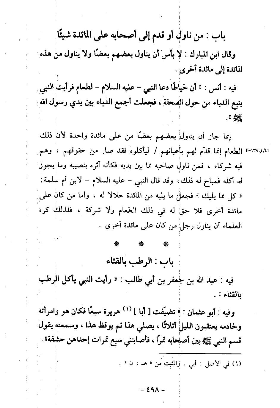 وَقَالَ ابْنُ الْمُبَارَكِ: لا بَأْسَ أَنْ يُنَاوِلَ بَعْضُهُمْ بَعْضًا، وَلا يُنَاوِلُ مِنْ هَذِهِ الْمَائِدَةِ إِلَى أُخْرَى. / 58 - فيه: أَنَس، إِنَّ خَيَّاطًا دَعَا النَّبِىّ عليه السلام لِطَعَامٍ، فَرَأَيْتُ النَّبِىّ عليه السلام يَتَتَبَّعُ الدُّبَّاءَ مِنْ حَوْلِ الصَّحْفَةِ، فَجَعَلْتُ أَجْمَعُ الدُّبَّاءَ بَيْنَ رسُول اللَّه (صلى الله عليه وسلم) . إنما جاز أن يناول بعضهم بعضًا من على مائدة واحدة لأن ذلك الطعام إنما قدم لهم بأعيانهم ليأكلوا فقد صار من حقوقهم، وهم فيه شركاء، فمن ناول صاحبه مما بين يديه فكأنه آثره بنصيبه ومايجوز له أكله فمباح له ذلك، وقد قال النبى عليه السلام لابن أم سلمة: (كل ما يليك) فجعل ما يليه من المائدة حلالاً له، وأما من كان على مائدة أخرى فلا حق له فى ذلك الطعام ولا شركة، فلذلك كره العلماء أن يناول رجل من كان على مائدة أخرى.