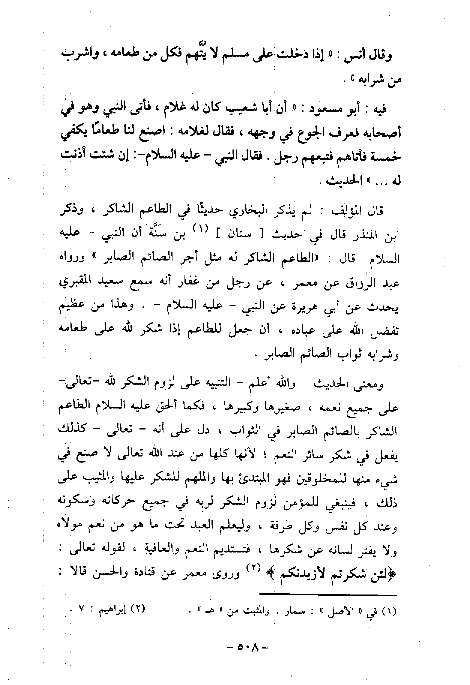 وَقَالَ أَنَسٌ: إِذَا دَخَلْتَ عَلَى مُسْلِمٍ لا يُتَّهَمُ، فَكُلْ مِنْ طَعَامِهِ وَاشْرَبْ مِنْ شَرَابِهِ. / 77 - فيه: أَبُو مَسْعُود، قَالَ: أن أَبَا شُعَيْبٍ كَانَ لَهُ غُلامٌ، فَأَتَى النَّبِى (صلى الله عليه وسلم) وَهُوَ فِى أَصْحَابِهِ، فَعَرَفَ الْجُوعَ فِى وَجْهِه،، فَقَالَ لغُلامهُ: اصْنَعْ لِنا طَعَامًا يَكْفِى خَمْسَةً لَعَلِّى أَدْعُو فَأَتَاهُم، فَتَبِعَهُمْ رَجُلٌ، فَقَالَ النَّبِى (صلى الله عليه وسلم) : (إِنْ شِئْتَ أَذِنْتَ لَهُ. . . .) الحديث. قال المؤلف: لم يذكر البخارى حديثا فى الطاعم الشاكر، وذكر ابن المنذر قال فى حديث سنان بن سنة أن النبى عليه السلام قال: (الطاعم الشاكر له مثل أجر الصائم الصابر) ورواه عبد الرزاق عن معمر، عن رجل من غفار أنه سمع سعيد المقبرى يحدث عن أبى هريرة عن النبى (صلى الله عليه وسلم) . وهذا من عظيم تفضل الله على عباده، أن جعل للطاعم إذا شكر لله على طعامه وشرباه ثواب الصائم الصابر. ومعنى الحديث - والله أعلم - التنبيه على لزوم الشكر لله تعالى على جميع نعمه، صغيرها وكبيرها، فكما الحق عليه السلام الطاعم الشاكر بالصائم الصابر فى الثواب، دل على أنه تعالى كذلك يفعل فى شكر سائر النعم؛ لأنها كلها من عند الله تعالى لاصنع فى شىء منها للمخلوقين فهو المبتدىء بها والمللهم للشكر عليها والمثيب على ذلك، فينبغى للمؤمن لزوم الشكر لربه فى جميع حركاته وسكونه وعند كل نفس وكل طرفة، وليعلم العبد تحت ماهو من نعم مولاه ولايفتر لسانه عن شكرها، فتستديم النعم والعافية، لقوله تعالى: (لئن شكرتم لأزيدنكم) وروى معمر عن قتادة والحسن، قالا: