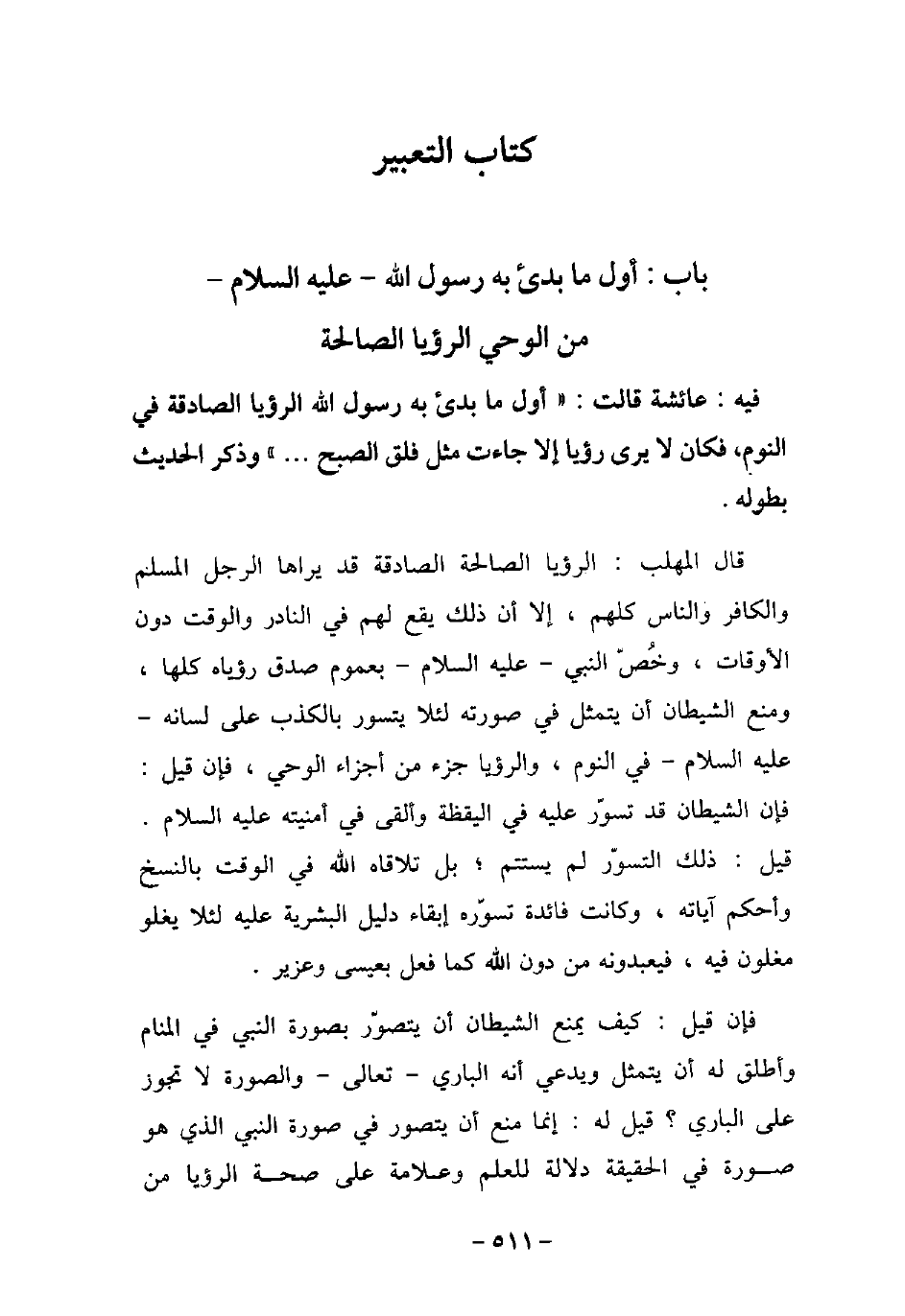 / 1 - فيه: عَائِشَةَ، قَالَتْ: أَوَّلُ مَا بُدِئَ بِهِ رَسُولُ اللَّهِ (صلى الله عليه وسلم) مِنَ الْوَحْيِ الرُّؤْيَا الصَّادِقَةُ فِي النَّوْمِ، فَكَانَ لا يَرَى رُؤْيَا إِلا جَاءَتْ مِثْلَ فَلَقِ الصُّبْحِ. . . وذكر الحديث بطوله. قال المهلب: الرؤيا الصالحة الصادقة قد يراها الرجل المسلم والكافر والناس كلهم، إلا أن ذلك يقع لهم فى النادر والوقت دون الأوقات، وخص النبى عليه السلام بعموم صدق رؤياه كلها، ومنع الشيطان أن يتمثل فى صورته لئلا يتسور بالكذب على لسانه عليه السلام فى النوم، والرؤيا جزء من أجزاء الوحى، فإن قيل: فإن الشيطان قد تسور عليه فى اليقظة وألقى فى أمنيته عليه السلام. قيل: ذلك التسور لم يستتم؛ بل تلاقاه الله فى الوقت بالنسخ وأحكم آياته، وكانت فائدة تسوره إبقاء دليل البشرية عليه لئلا يغلو مغلون فيه، فيعبدونه من دون الله كما فعل بعيسى وعزير. فإن قيل: كيف يمنع الشيطان أن يتصور بصورة النبى فى المنام وأطلق له أن يتمثل ويدعى أنا البارى تعالى والصورة لاتجوز على البارى؟ قيل له: إنما منع أن يتصور فى صورة النبى الذى هو صورة فى الحقيقة دلالة للعلم وعلامة على صحة الرؤيا من