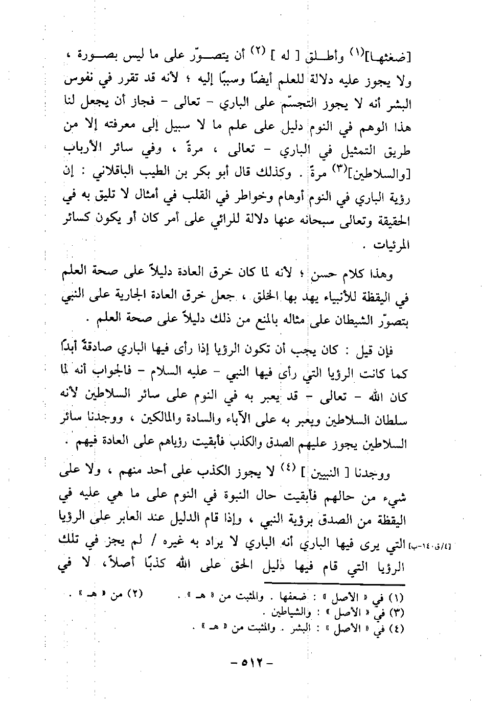ضغثها وأطلق له أن يتصور على ماليس بصورة على ماليس بصورة، ولايجوز عليه دلالة للعلم أيضًا وسببًا إليه؛ لأنه قد تقرر فى نفوس البشر أنه لايجوز التجسم على البارى - تعالى فجاز أن يجعل لنا هذا الوهم فى النوم دليل على علم ما لاسبيل إلى معرفته إلا من طريق التمثيل فى البارى - تعالى، مرة، وفى سائر الأرباب والسلاطين مرة. وكذلك قال أبو بكر بن الطيب الباقلانى: إن رؤية البارى فى النوم أوهام وخواطر فى القلب فى أمثال لاتليق به فى الحقيقة وتعالى سبحانه عنها دلالة للرائى على أمر كان أو يكون مسائر المرئيات. وهذا كلام حسن؛ لأنه لما كان خرق العادة دلالاً على صحة العلم فى اليقظة للأنبياء يهد بها الخلق، جعل خرق العادة الجارية على النبى يتصور الشيطان على مثاله بالمنع من ذلك دليلاً على صحة العلم. فإن قيل: كان يجب أن تكون الرؤيا إذا رأى فيها البارى صادقة أبدًا كما كانت الرؤيا التى رأى فيها النبى عليه السلام فالجواب أنه لما كان الله تعالى قد يعبر به فى النوم علس سائر السلاطين لأنه سلطان السلاطين ويعبر له على الاباء والسادة والمالكين، ووجدنا سائر السلاطين يجوز عليهم الصدق والكذب فأبقيت رؤياهم على العادة فيهم. ووجدنا النبيين لا يجوز الكذب على أحد منهم، ولا على شىء من حالهم فابقيت حال النبوة فى النوم على ماهى عليه فى اليقظة من الصدق برؤية النبى، وإذا قام الدليل عند العابر على الرؤيا التى يرى فيها البارى لايراد به غيره لم يجز فى تلك الرؤيا التى قام فيها دليل الحق على الله كذبًا أصلاً، لا في
