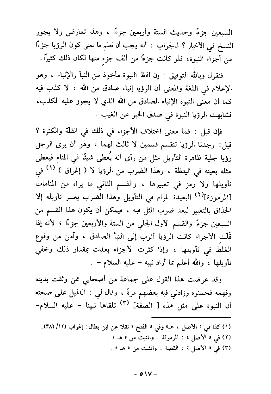 السبعين جزءًا وحديث الستة واربعين جزءًا، وهذا تعارض ولايجوز النسخ فى الأخبار؟ فالجواب: أنه يجب أن نعلم مامعنى كون الرؤيا جزءًا من أجزاء النبوة فلو كانت جزءًا من الف جزء منها لكان ذلك كثيرًا. فنقول وبالله التوفيق: إن لفظ النبوة مأخوذ من النبأ والإنباء، وهو الإعلام فى اللغة والمعنى أن الرؤيا إنباء صادق من الله، لاكذب فيه كما أن معنى النبوة الإنباء الصادق من الله الذى لايجوز عليه الكذب فتشاهبهت الؤيا النبوة فى صدق الخبر عن الغيب. فإن قيل: فما معى اختلاف الأجزاء فى ذلك فى القلة والكثرة؟ قيل: وجدنا الرؤيا تنقسم قسمين لا ثالث لهما، وهو أن يرى الرجل رؤيا جلية ظاهرة التأويل مثل من رأى أنه يعطى شيئًا فى المنام فيعطى مثله بعينه فى اليقظة، وهذا الضرب من الرؤيا لا إغراق فى تأويلها ولا رمز فى تعبيرها، والقسم الثانى مايراه من المنامات المرموزة البعيدة المرام فى التأويل وهذا الضرب يعسر تأويله إلا الحذاق بالتعبير لبعد ضرب المثل فيه، فيمكن أن يكون هذا القسم من السبعين جزءًا كانت الرؤيا أقرب إلى النبأ الصادق، وآمن من وقوع الغلط فى تأويلها، وإذا كثرت الأجزاء بعدت بمقدار ذلك وخفى تأويلها، والله أعلم بما أراد نبيه (صلى الله عليه وسلم) . وقد عرضت هذا القول على جماعة من أصحابى ممن وثقت بدينة وفهمه فحسنوه وزادنى فيه بعضهم مرة، وقال لى: الدليل على صحته أن النبوة على مثل هذه الصفة تلقاها نبينا عليه السلام