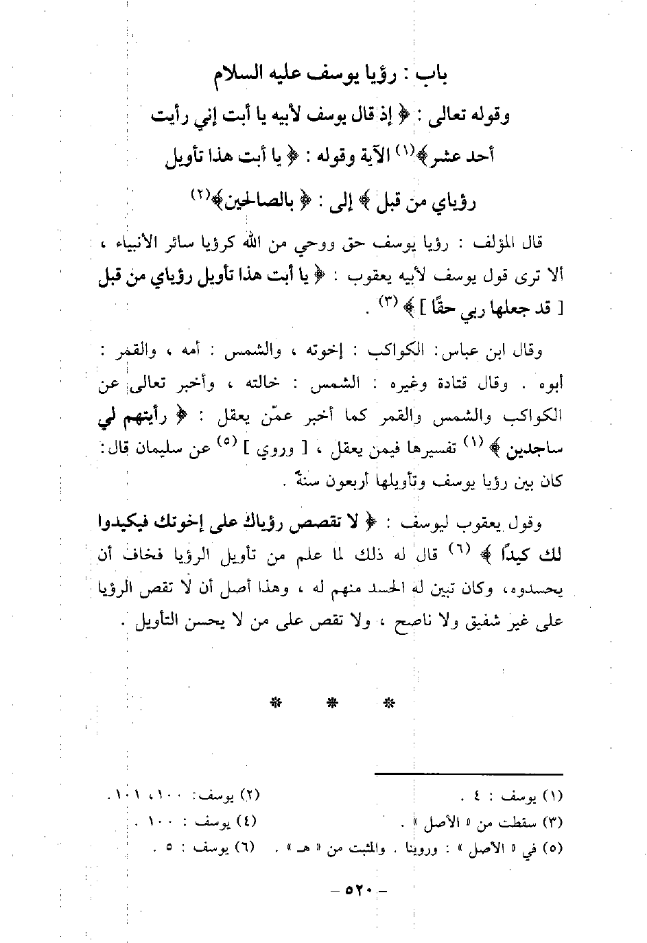 وَقَوْلِهِ تَعَالَى: (إِذْ قَالَ يُوسُفُ لأبِيهِ يَا أَبَتِ إِنِّى رَأَيْتُ أَحَدَ عَشَرَ كَوْكَبًا (الآية [يوسف: 4] ، وَقَوْلِهِ: (يَا أَبَتِ هَذَا تَأْوِيلُ رُؤْيَاىَ مِنْ قَبْلُ (إلى) بِالصَّالِحِينَ) [يوسف: 100] . قال المؤلف: رؤيا يوسف حق ووحى من الله كرؤيا سائر الأنبياء، ألا ترى قول يوسف لأبيه يعقوب: (يا أبت هذا تأويل رؤياى من قبل قد جعلها ربى حقًا) . وقول بعقوب ليوسف: (لا تقصص رؤياك على إخواتك فيكيدوا لك كيدًا) قال له ذلك علم من تأويل الرؤيا فخاف أن يحسدوه، وكان تبين له الحسد منهم له، وهذا أصل أن لاتقص الرؤيا على غير شفيق ولاناصح، ولاتقص على من لا يحسن التأويل.