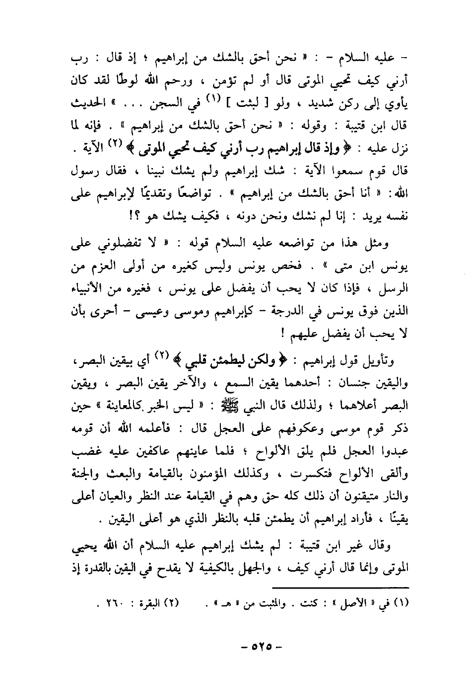 - عليه السلام -: (نحن أحق بالشك من إبراهيم؛ إذ قال: رب أرنى كيف تحيى الموتى قال أو لم تؤمن، ورحم الله لوطًا لقد كان ياوى إلى ركن شديد، ولو ثبت فى السجن. . .) الحديث قال ابن قتيبة: وقوله: (نحن أحق بالشك من إبراهيم) . فإنه لما نزل عليه: (وإذا قال إبراهيم رب أرنى كيف تحيى الموتي) الآية. قال قوم سمعوا الآية: شك إبراهيم ولم يشك نبينا، فقال رسول الله: (أنا أحق بالشك من إبراهيم) . تواضعًا وتقديما لإبراهيم على نفسه يريد: إنا لم نشك ونحن دونه، فكيف يشك هو؟ . ومثل هذا من تواضعه عليه السلام قوله: (لا تفضلونى على يونس ابن متى) . فخص يونس وليس كغيره من أولى العزم من الرسل، فإذا كان لايحب أن يفضل على يونس، فغيره من الأنبياء بأن لايحب أن يفضل عليهم. وتأويل قول إبراهيم: (ولكن ليطمئن قلبى) أى بيقين البصر، واليقين جنسان: أحدهما يقين السمع، والآخر يقين البصر، ويقين البصر أعلاهما؛ ولذلك قال النبى (صلى الله عليه وسلم) : (ليس الخبر كالمعاينة) حين ذكر قوم موسى وعكوفيهم على العجل قال: فأعلمه الله أن قومه عبدوا العجل فلم يلق الألواح؛ فلما عاينهم وعاكفين عليه غضب وألقى الألواح فتكسرت، وكذلك المؤمنون بالقيامة والبعث والجنة والنار متيقنون أن ذلك كله حق وهم فى القيامة عند النظر وعيان أعلى يقينًا، فأراد إبراهيم أن يطمئن قلبه بالنظر الذى هو أعلى اليقين. وقال غير ابن قتيبة: لم يشك إبراهيم عليه السلام أن الله يحيى الموتى وإنما قال: أرنى كيف، والجهل بالكيفية لايقدح فى اليقين بالقدرة إذ