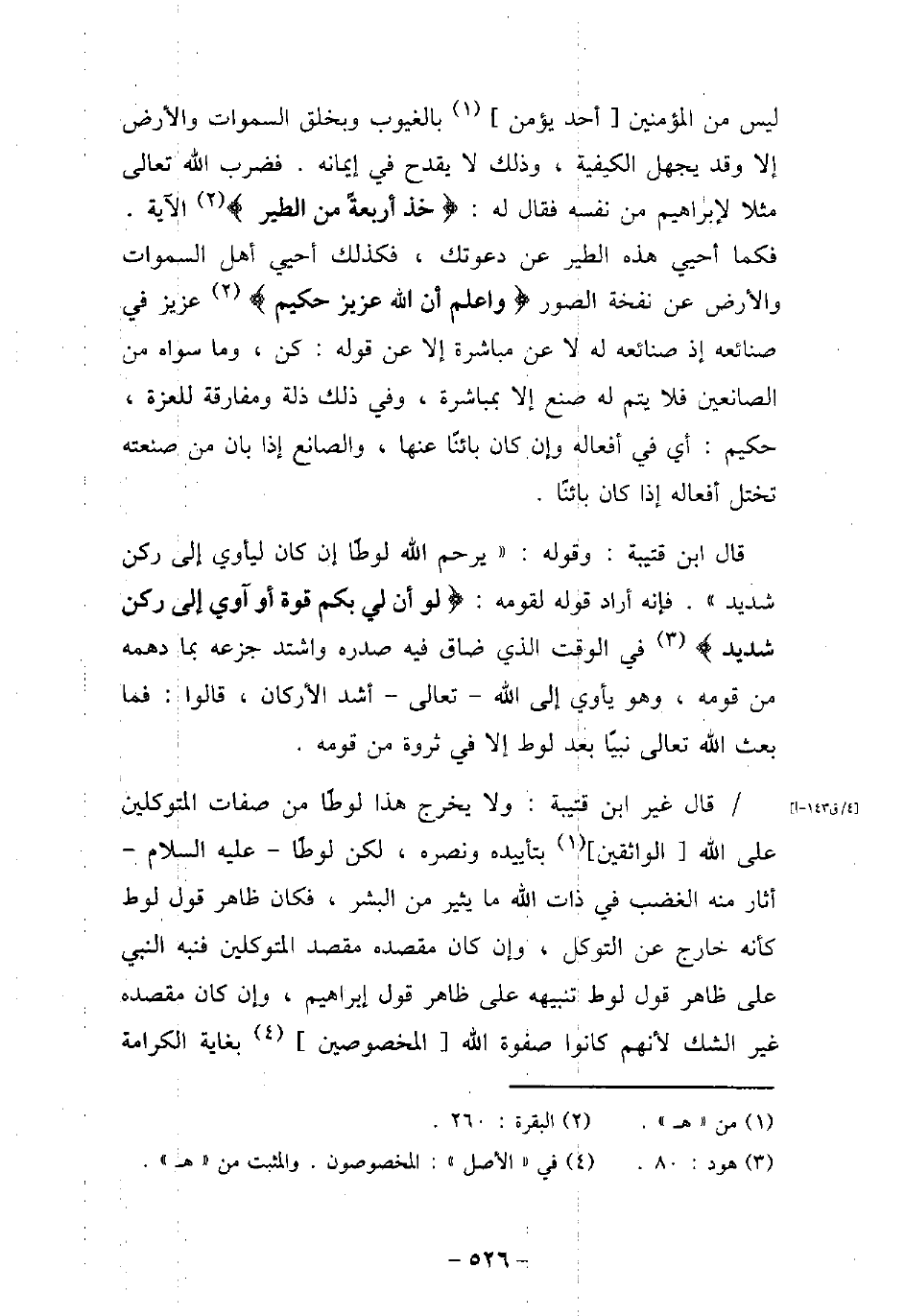 ليس من المؤمنين أحد يؤمن بالغيوب وبخلق السموات والأرض إلا وقد يجهل الكيفية، وذلك لايقدح فى إيمانه. فضرب الله تعالى مثلا لإبراهيم من نفسه فقال له: (خذ اربعة من الطير) الآية. فكما أحيى هذه الطير عن دعوتك، فكذلك أحيى أهل السموات والأرض عن نفخه الصور (وأعلم أن الله عزيز حكيم) عزيز فى صنائعه إذ صنائعه له عن مباشرة إلا عن قوله: كن، وماسواه من الصانعين فلا يتم له صنع إلا بمباشرة، وفى ذلك ذله ومفارقة للعزة، حكيم: أى فى أفعاله وإن كان بائنًا عنها، والصانع إذا بان من صنعته تختل أفعاله إذا كان بائنًا. قال ابن قتيبة: وقوله: (يرحم الله لوطًا إن كان ليأوى إلى ركن شديد) فإنه أراد قوله لقومه: (لو أن لى بكم قوة أو آوى إلى ركن شديد) وفى الوقت الذى ضاق فيه صدره واشتد جزعه بنا دهمه من قومه، وهو يأوى إلى الله تعالى اشد اركان، قالووا: فما بعث الله تعالى نبيًا بعد لوط إلا فى ثروة من قومه. قال غير ابن قتيبة: ولايخرج هذا لوطًا من صفات المتوكلين على الله الواثقين بتأيده ونصره، لكن لوطًا - عليه السلام أثار منه الغضب فى ذات الله مايثير من البشر، فكان ظاهر قول لوط كأنه خارج عن التوكل، وإن كان مقصده مقصد المتوكلين فنبه النبى على ظاهر قول لوط تنبيه على ظاهر قول إبراهيم، وإن كان مقصده غير الشك لأنهم كانوا صفوة الله المخصوصين بغاية الكرامة