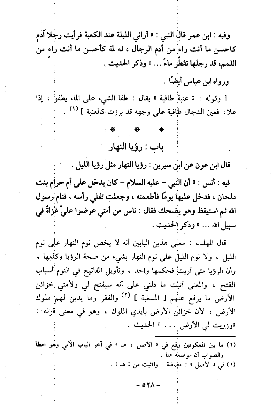 قَالَ ابْنُ عَوْنٍ، عَنِ ابْنِ سِيرِينَ: رُؤْيَا النَّهَارِ مِثْلُ رُؤْيَا اللَّيْلِ. / 13 - فيه: أَنَس، أَنَّ النَّبِىّ عليه السلام كَانَ يَدْخُلُ عَلَى أُمِّ حَرَامٍ بِنْتِ مِلْحَانَ، فَدَخَلَ عَلَيْهَا يَوْمًا، فَأَطْعَمَتْهُ، وَجَعَلَتْ تَفْلِى رَأْسَهُ، فَنَامَ رَسُولُ اللَّهِ (صلى الله عليه وسلم) ثُمَّ اسْتَيْقَظَ، وَهُوَ يَضْحَكُ، فَقَالَ: نَاسٌ مِنْ أُمَّتِى عُرِضُوا عَلَىَّ غُزَاةً فِى سَبِيلِ اللَّهِ. . .) وذكر الحديث. قال المهلب: معنى هذهين البابين أنه لايخص نوم النهار على نوم الليل، ولانوم الليل على نوم النهار بشىء من صحة الرؤيا وكذبها، وأن الرؤيا متى اريت فحكمها واحد، وتأويل المفاتيح فى النوم أسباب الفتح، والمعنى أتيت مادلنى على أنه سيفتح لى ولأمتى خزائن الأرض مايرفع عنهم المسغبة والفقر ومايدين لهم ملوك الأرض؛ لأن خزائن الأرض بأيدى الملوك، وهو فى معنى قوله: (وزويت لى الأرض. . .) الحديث.