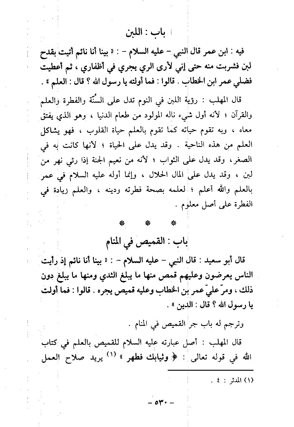 / 15 - فيه: ابْن عُمَر، قَالَ النَّبِىّ (صلى الله عليه وسلم) : (بَيْنَا أَنَا نَائِمٌ، أُتِيتُ بِقَدَحِ لَبَنٍ فَشَرِبْتُ مِنْهُ حَتَّى إِنِّى لأرَى الرِّى يَخْرُجُ مِنْ أَظْفَارِى، ثُمَّ أَعْطَيْتُ فَضْلِى عُمَرَ بْنَ الْخَطَّابِ) ، قَالُوا: فَمَا أَوَّلْتَهُ يَا رَسُولَ اللَّهِ؟ قَالَ: (الْعِلْمَ) . قال المهلب: رؤية اللبن فى النوم تدل على السنة والفطرة والعلم والقرآن؛ لأنه أول شىء ناله المولود من طعام الدنيا، وهو الذى يفتق معاه، وبه تقوم حياته كما تقوم بالعلم حياة القلوب، فهو يشاكل العلم من هذه الناحية. وقد يدل على الحياة؛ لأنها كانت به فى الصغر، وقد يدل على الثواب؛ لأنه من نعيم الجنة إذا رئى نهر من لبن، وقد يدل على المال الحلال، وإنما أوله عليه السلام فى عمر بالعلم والله أعلم؛ لعلمه بصحة فطرته ودينه، والعلم زيادة فى الفطرة على اصل معلوم.