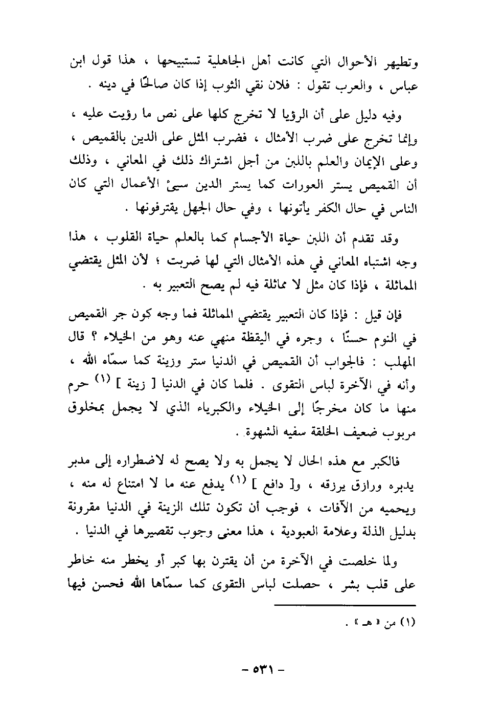 وتطهير الأحوال التى كانت أهل الجاهلية تستبيحها، هذا قول ابن عباس، والعرب تقول: فلان نقى الثوب إذا كان صالحًا فى دينه. وفيه دليل على أن الرؤيا لاتخرج كلها على نص مارؤيت عليه، وإنما تخرج على ضرب الأمثال، فضرب المثل على الدين بالقميص، وعلى الإيمان والعلم باللبن من أجل اشتراك ذلك فى المعانى، وذلك أن القميص يستر العورات كما يستر الدين الأعمال التى كان الناس فى حال الكفر يأتونها، وفى حال الجهل يقترفونها. وقد تقدم أن اللبن حياة الأجسام كما بالعلم حياة القلوب، هذا وجه اشتباه المعانى فى هذه الأمثال التى لها ضربت؛ لأن المثل يقتضى المماثلة، فإذا كان مثل لا مماثلة فيه لم يصح التعبير به. فإن قيل: فإذا كان التعبير يقتضى المماثلة فما وجه كون جر القميص فى النوم حسنأط، وجره فى اليقظة منهى عنه وهو من الخيلاء؟ قال المهلب: فالجواب أن القميص فى الدنيا ستر وزينة كما سماه الله، وأنه فى الآخرة لباس لاتقوى. فلما كان فى الدنيا زينة حرم منها ماكان مخرجًا إلى الخيلاء والكبرياء الذى لايجمل بمخلوق مربوب ضعيف الخلقة سفيه الشهوة. فالكبر مع هذه الحال لا يجمل به ولا يصح له لا ضراره إلى مدبر يديره ورازق يرزقه، ودافع يدفع عنه ما لا امتناع له منه، ويحميه من الآفات، فوجب أن تكون تلك الزينة فى الدنيا مقرونة بدليل الذلة وعلامة العبودية، هذا معنى وجوب تقصيرها فى الدنيا. ولما خلصت فى الآخرة من أن يقترن بها كبر أو يخطر منه خارط على قلب بشر، حصلت لباس التقوى كما سماها الله فحسن فيها