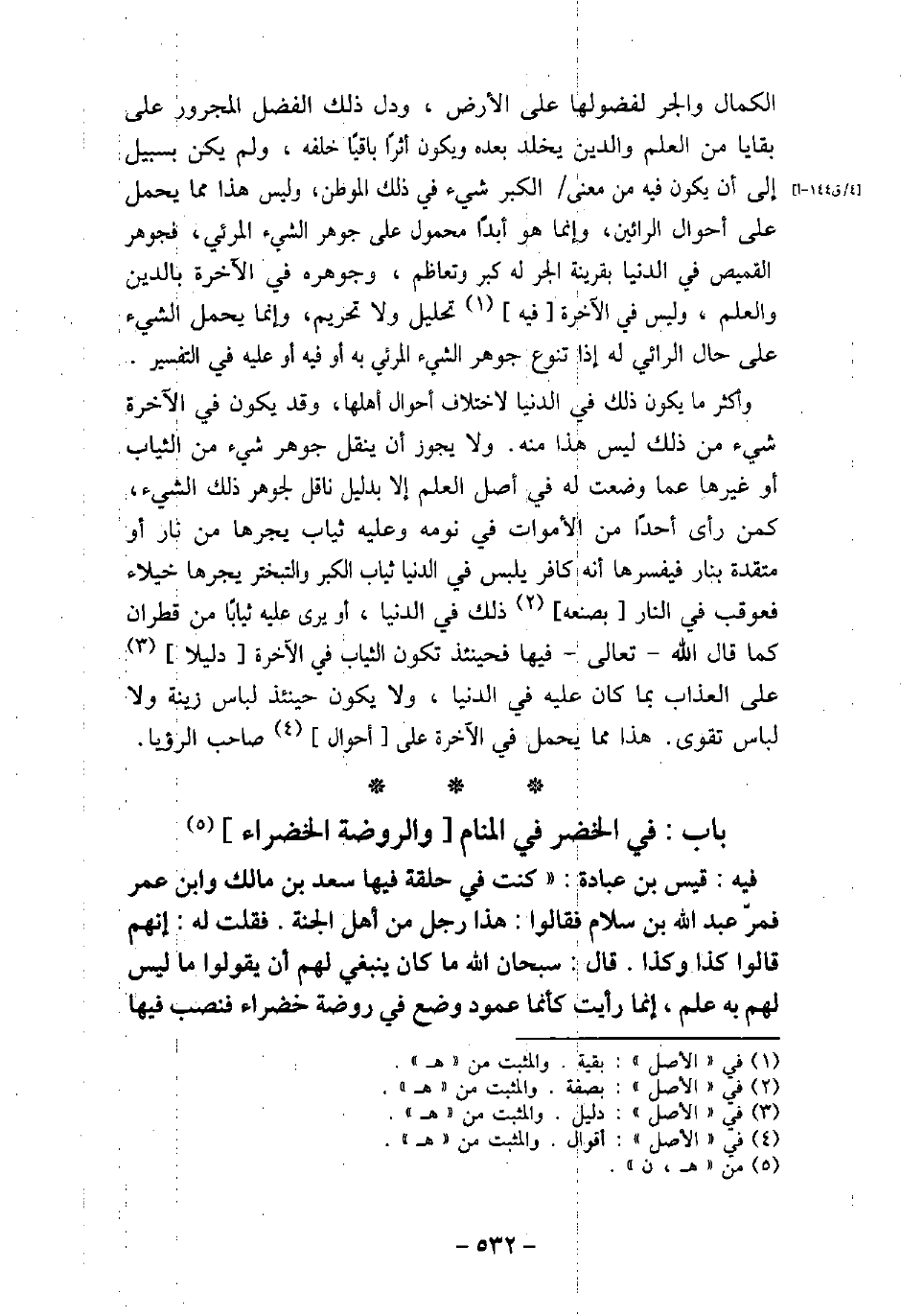 الكمال والجر لفضولها على الأرض، ودل ذلك الفضل المجرور على بقايا من العلم والدين يخلد ويكون أثرًا باقيًا خلفه، ولم يكن بسبيل إلى أن يكون فيه من معنى الكبر شىء فى ذلك الموطن، وليس هذا مما يحمل على أحوال الرائين، وإنما هو ابدًا محمول على جوهر الشىء المرئى، فجوهرالقميص فى الدنيا بقرينة الجر له كبر وتعاظم، وجوهرة فى الآخرة بالدين والعلم، وليس فى الآخرة فيه تحليل ولاتحريم، وإنما يحمل الشىء على حال الرائى له إذا تنوع جوهر الشىء المرئى به فيه أو عليه فى التفسير. وأكثر ما يكون ذلك فى الدنيا لاختلاف الشىء أحوال أهلها، وقد يكون فى الآخرة شىء من ذلك ليس هذا منه. ولايجوز أن ينقل جوهر شىء من الثياب أو غيرها عما وضعت له فى أصل العلم إلا بدليل ناقل لجوهر ذلك الشىء، كمن رأى أحدًا من الأموات فى نومه وعليه ثياب يجرها من نار أو متقدة بنار فيفسرها أنه كافر يلبس فى الدنيا ثياب الكبر والتبختر يجرها خيلاء فعوقب فى النار بصنعه ذلك فى الدنيا، أو يرى عليه ثيابًا من قطران كما قال الله تعالى فيها فحينئذ تكون الثياب فى الآخرة دليلاً على العذاب بما كان عليه فى الدنيا، ولايكون حيئذ لباس زينة ولا لباس تقوى. هذا مما يحمل فى الآخرة على أحوال صاحب الرؤيا.