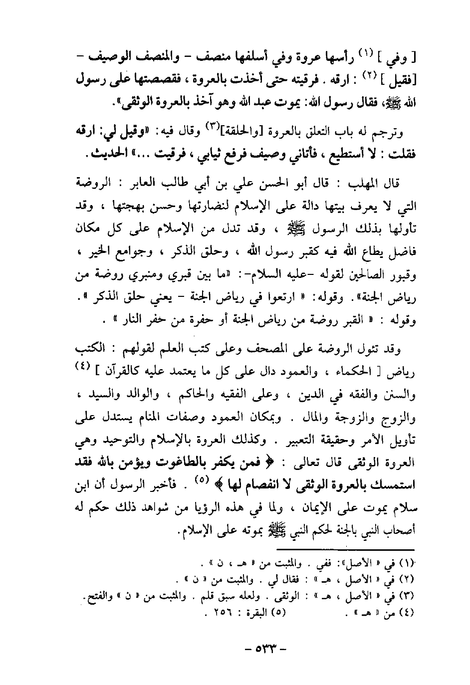 وَفِي رَأْسِهَا عُرْوَةٌ، وَفِى أَسْفَلِهَا مِنْصَفٌ، وَالْمِنْصَفُ الْوَصِيفُ، فَقِيلَ ارْقَهْ فَرَقِيتُهُ حَتَّى أَخَذْتُ بِالْعُرْوَةِ، فَقَصَصْتُهَا عَلَى رَسُولِ اللَّهِ (صلى الله عليه وسلم) ، فَقَالَ رَسُولُ اللَّهِ (صلى الله عليه وسلم) : (يَمُوتُ عَبْدُاللَّهِ، وَهُوَ آخِذٌ بِالْعُرْوَةِ الْوُثْقَى) . وترجم له باب التعلق بالعروة والحلقة وقال فيه: (وقيل لى: أرقه فقلت: لا أستطيع، فأتانى وصيف فرفع ثيابى، فرقيت. . .) الحديث. قال المهلب: قال أبو الحسن على بن أبى طالب العابر: الروضة التى لايعرف بيتها دالة على الإسلام لنضرتها وحسن بهجتها، وقد تأولها بذلك الرسول عليه السلام و، وقد تدل من الإسلام على كل مكان فاضل يطاع الله فيه كقبر رسول الله، وحلق الذكر، وجوامع الخير، وقبور الصالحين لقوله (صلى الله عليه وسلم) : (ما بين قبرى ومنبرى روضة من رياض الجنة) . وقوله: (ارتعوا فى رياض الجنة أو حفرة من حفر النار) . وقد تئول الروضة على المصحف وعلى كتب العلم لقولهم: الكتب رياض الحكماء، والعمود دال على كل ما يعتمد عليه القرآن والسنن والفقه فى الدين، وعلى الفقيه والحاكم، والوالد والسيد، والزوج والزوجة والمال. وبمكان العمود وصفات المنام يستدل على تأويل الأمر وحقيقة التعبير. وكذلك العروة بالإسلام والتوحيد وهى العروة الوثقى قال تعالى: (فمن يكفر بالطاغوت ويؤمن بالله فقد استمسك بالعروة الوثقى لاانفصام لها) . فأخبر الرسول أن ابن سلام يموت على الإيمان، ولما فى هذه الرؤيا من شواهد ذلك حكم له اصحاب النبى بالجنة لحكم النبى عليه السلام بموته على الإسلام.