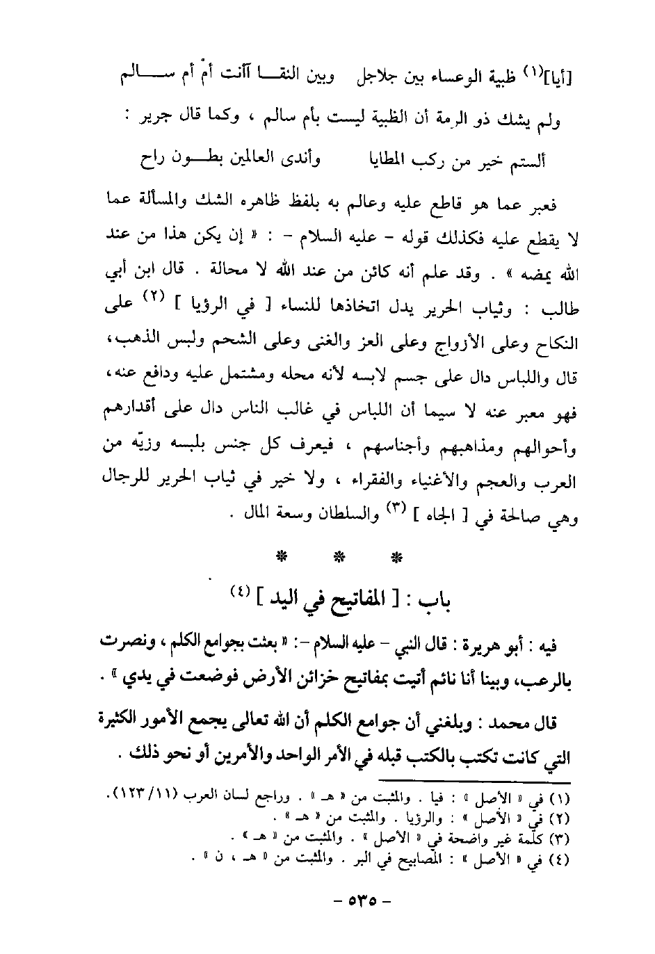 أيا ظبية الوعساء بين جلاجل وبين النقا آأنت أم أم سالم ولم يشك ذو الرمة أن الظبية ليست بأم سالم، وكما قال جرير: ألستم خير من ركب المطايا وأندى العالمين بطون راح. فعبر عما هو قاطع عليه وعالم به بلفظ ظاهره الشك والمسالة عما لايقطع عليه فكذلك قوله (صلى الله عليه وسلم) : (إن يكن هذا ابن أبى طالب) وثياب الحرير يدل اتخاذها للنساء فى الرؤيا على النكاح وعلى الأزواج وعلى العز والغنى وعلى الشحم ولبس الذهب، قال واللباس دال على جسم لابسه لأنه محله ومشتمل عليه ودافع عنه، فهو معبر عنه لاسيما أن اللباس فى غالب الناس دال على أقدارهم وأحوالهم ومذاهبهم وأجناسهم، فيعرف كل جنس بلبسه وزيه من العرب والعجم والأغنياء والفقراء، ولاخير فى ثياب الحرير للرجال وهى صالحة فى الجاه والسلطان وسعة المال.